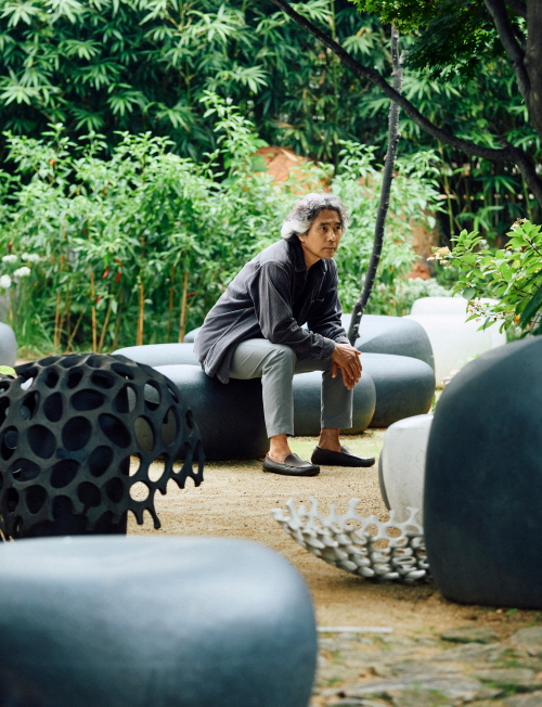 검은 바위처럼 보이는 〈집〉은 씨앗을 형상화한 작품이다. 이는 전통 옹기 제작 기법인 타렴(打簾)으로 만든 것으로, 흙 가락을 쌓아 올리며 두드려 형태를 완성한다. 한 달 넘게 지속되는 고된 노동이지만, 반복되는 리듬 속에서 작가는 생각을 비우고 흙 자체와 만난다. 그렇게 빚어진 작품은 자연 속에 놓였을 때 경계를 잃는다. 마치 원래 그 자리에 있었던 것처럼, 풍경 일부가 되어버린다.