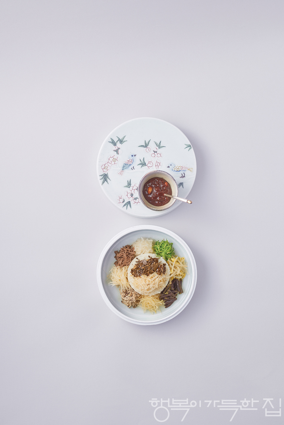 1 콩나물은 2~3cm 길이로 짧게 잘라서 끓는 물에 삶아 참기름과 소금을 약간 넣고 무친다. 무는 채 썰어서 들기름과 생강즙, 소금 약간, 물 2~3큰술을 넣고 끓여서 체에 건져 물기를 뺀다. 더덕과 도라지는 껍질을 벗기고 채 썬 후 각각 볶아 소금으로 간한다.
