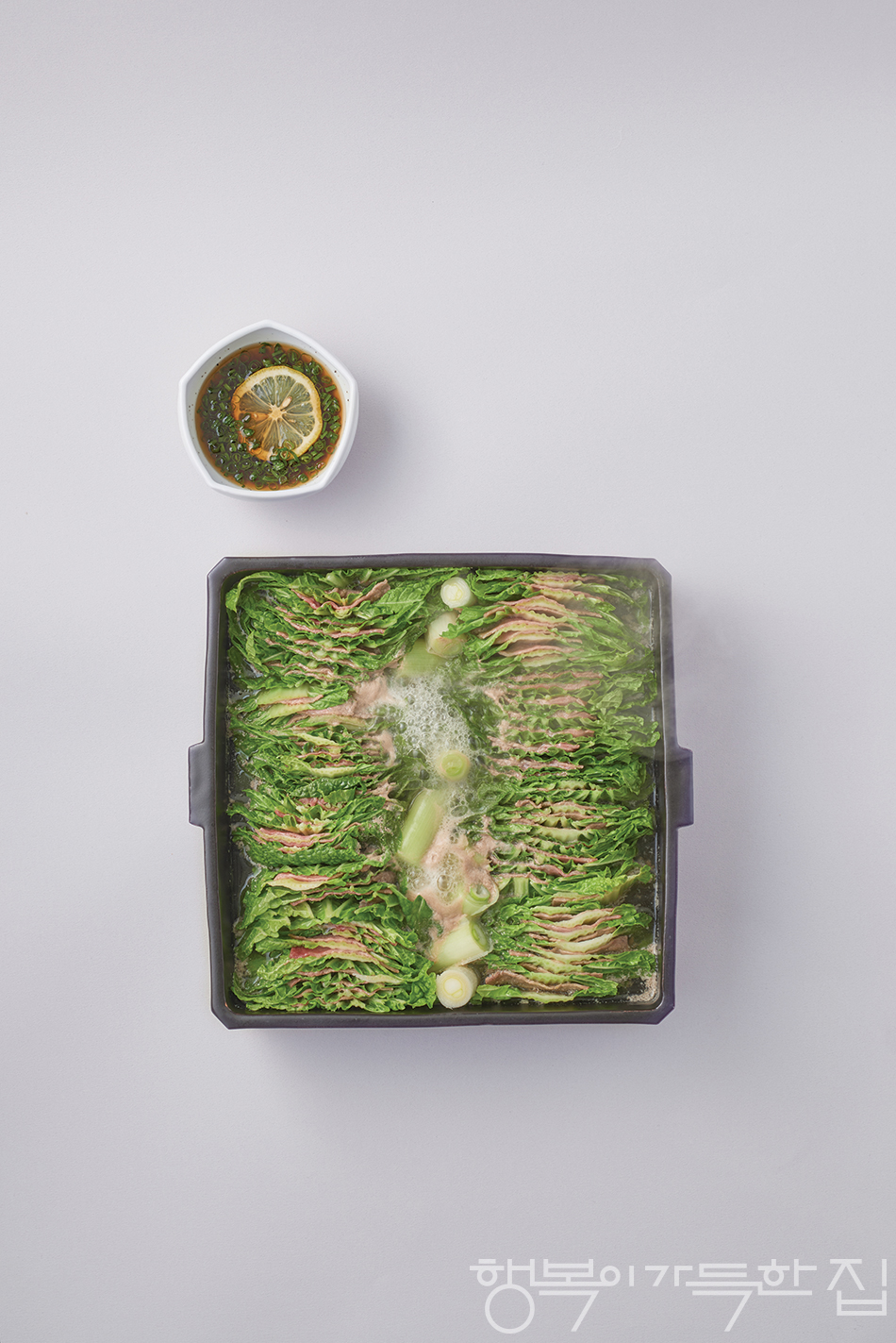 3 냄비에 분사식 통들깨 들기름을 고루 뿌리고 ②의 배추와 돼지고기를 넣어 볶다가 물 2컵과 새우젓을 넣어 섞은 뒤 돼지고기가 충분히 익도록 끓인다.