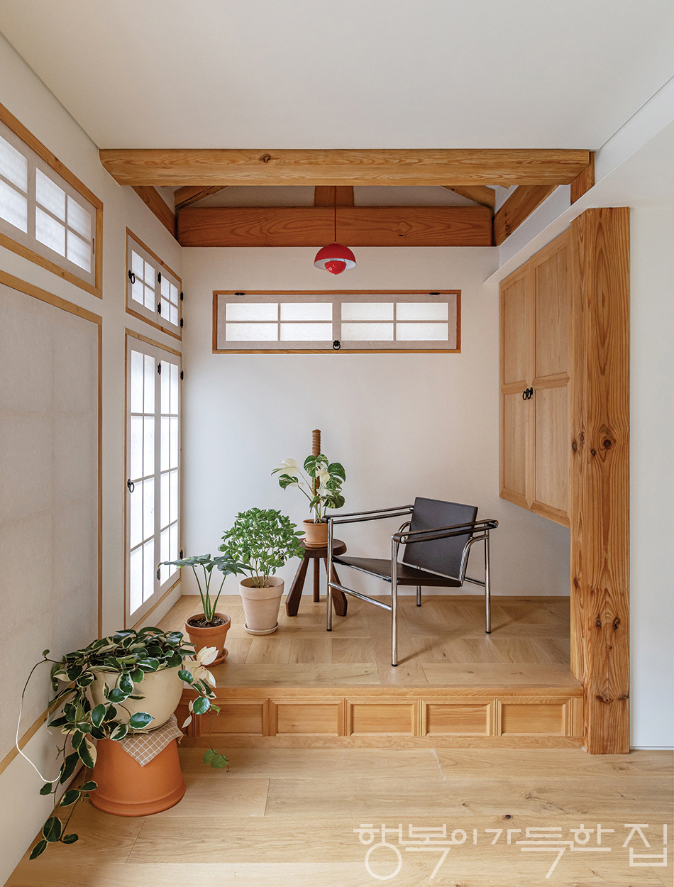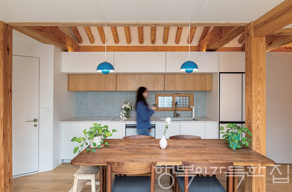 어번디테일 건축사사무소는 ㄷ자 구조의 한옥에서 주방 겸 거실 공간의 개방감을 확보하는 데 주안점을 두었다. 또한 공간의 효율을 위해 수납장을 최대한 마련했다.