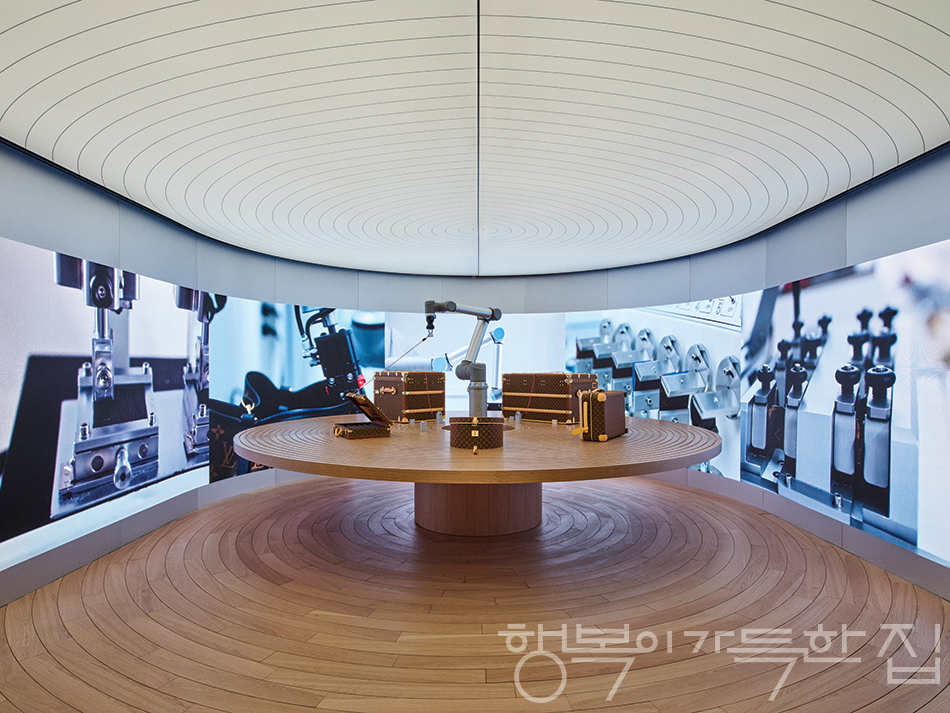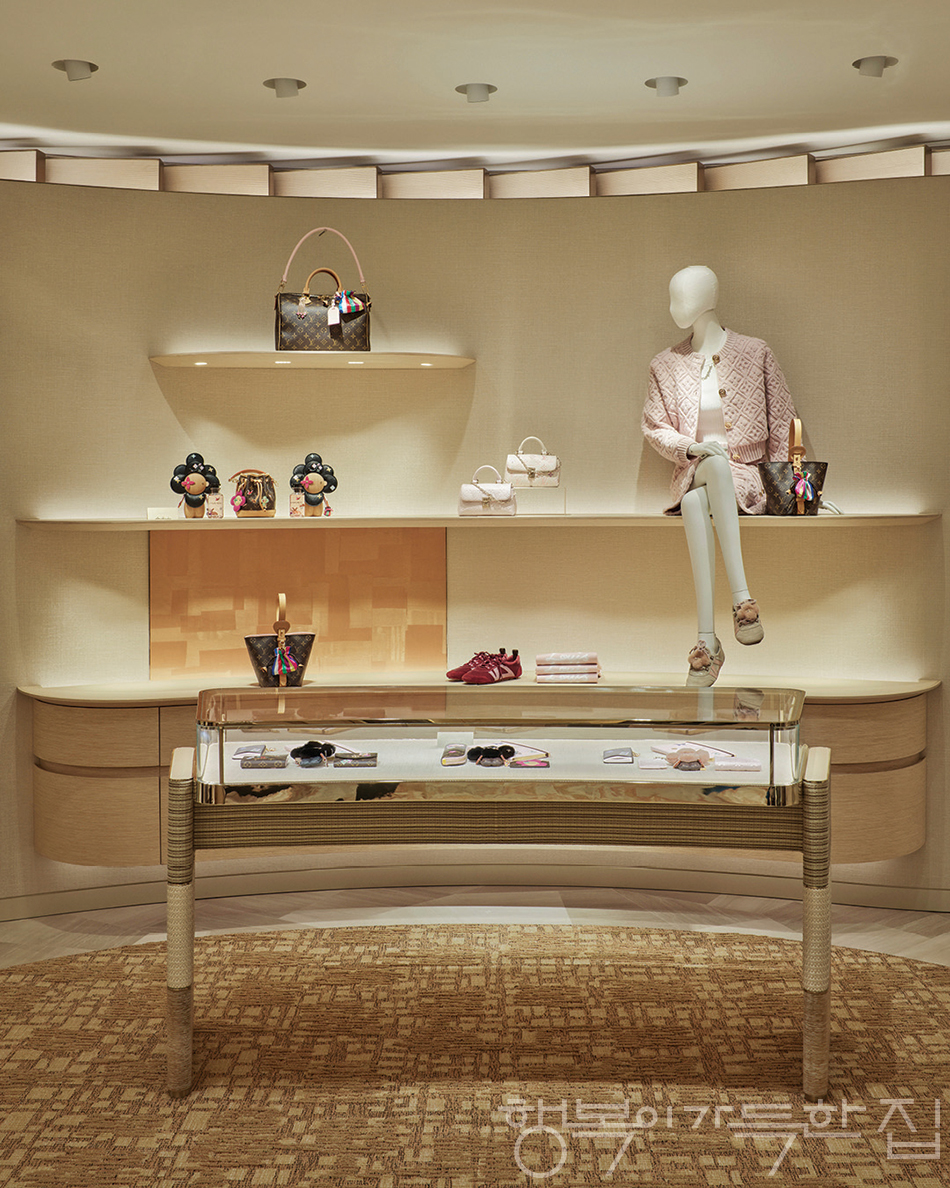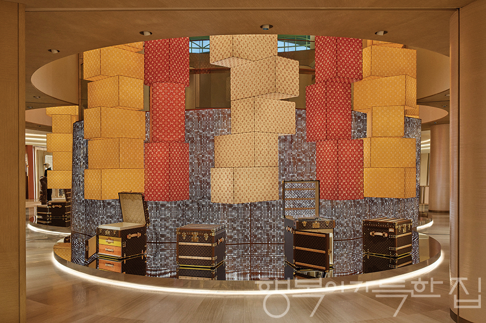 공간 곳곳을 채우는 한국적 미감도 주목할 부분. 매장은 전통 색동 컬러에서 영감받은 컬러 팔레트를 사용했고, 층마다 다른 전통 문양을 모티프로 천장을 장식했다. 매장 벽면에는 이현정 작가가 한지를 펴 발라 만든 파도가 일렁이고, 아트리움의 거대한 트렁크 기둥은 모노그램 패턴을 입힌 한지 사이로 은은하게 빛을 퍼뜨리며 존재감을 드러낸다.