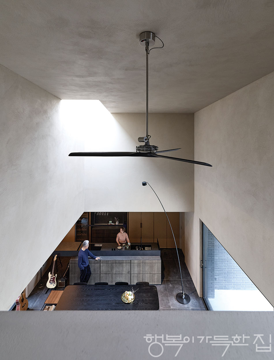 2층에서 내려다본 거실과 주방. 낚싯대처럼 쭉 뻗은 다비데 그로피 조명이 이곳의 아이콘 중 하나다.