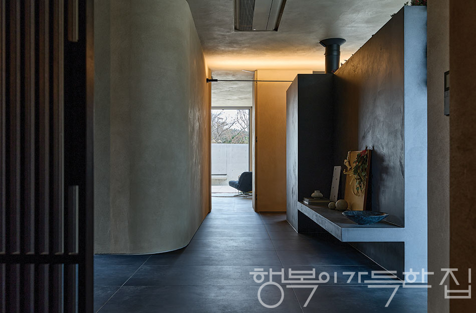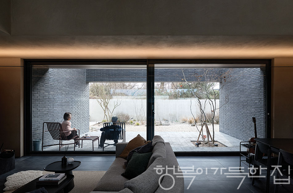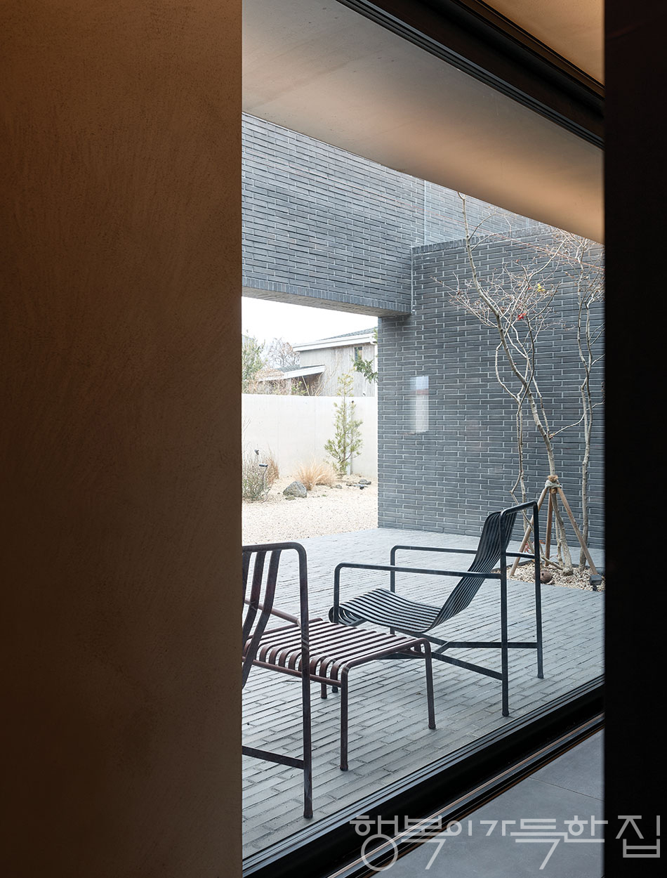 그 힘든 고난을 넘길 수 있었던 결정적 이유는 STUDIO 승호를 이끄는 건축가 이승호 소장을 향한 믿음 덕분이었다. 가마에서 구운 검은색 전돌로 마감한 외관부터 두 겹으로 견고하게 세운 벽체까지 ‘안전한 개방감’을 구현해준 건축가에게 온전한 신뢰심을 지니게 되었다. 서두에 창 없는 파사드를 언급했는데, 실내로 들어가면 그런 폐쇄성이 전혀 느껴지지 않는다. 거실에 있거나 중정으로 나와 앉으면 ‘뜬 벽’ 아래로 정원이 펼쳐지고, 그 너머에 있는 또 한 단의 외벽 위로는 저지리의 야생 숲과 제주의 하늘이 아득하게 펼쳐진다. 한마디로 바깥에서는 닫혀 있고, 안에서는 활짝 열려 있는 집! 천고를 최대한 높여 안전한 동굴에 있는 듯한 느낌을 부각하고, 이윤경 대표의 로망이던 노천탕을 큰 설계와 미감에 거슬리지 않는 선에서 단정하게 마련해 넣고, 남편의 아지트를 2층 모서리에 별도의 공간처럼 배치하는 등 집주인을 위한 배려도 곳곳에 담겨 있다.