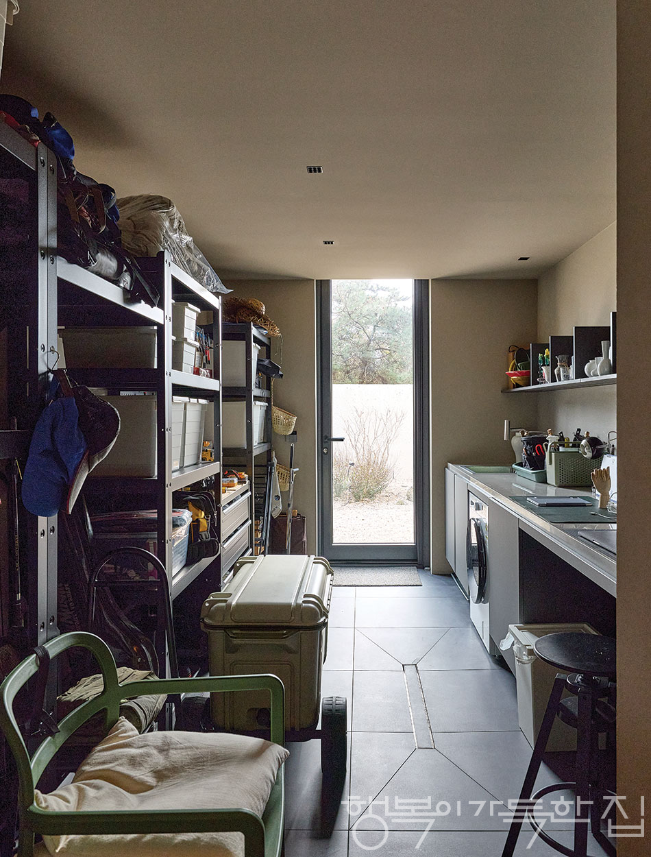 “그래서 이분들은 제주도에 집을 짓고 행복하게 살았답니다” 하고 이야기 하는 것 같지만 집 짓는 과정은 결코 순탄치 않았다. 취재를 하다 보면 집 짓기는 왜 이렇게 죄다 고난의 연속인지. “주체적이고 풍성한 삶을 위해 내게 꼭 맞는 집을 짓고 사세요” 하고 자주 말하는데, 집이 완공되기까지의 과정과 에피소드를 듣다 보면 어느새 ‘집 짓지 마세요’ 하는 결론으로 기우는 것 같아 찜찜할 때가 많다. 이 부부의 집 짓기도 웃음보다 눈물, 희망보다 좌절의 연속이었다. 골조를 올리고 1차 목공을 마쳤는데 비가 새서 공사 기간이 길어지고, 현장에 가보니 약속한 타일이 아닌 타일이 깔려 있고, 햇빛 쨍쨍인데 눈이 올 것 같다며 현장에 나타나지 않고…. 하지만 이런 사례를 일일이 열거하며 겁을 주고 싶지는 않다. 이 단계에서 중요한 것은 굳은 마음가짐. 어떻게든 이 어둡고 축축한 터널을 통과하고 말겠다는 다짐이 필요하다. “어떤 일이든 그 안에 고난은 있게 마련이잖아요. 좌절도 하고 주저앉기도 하지만, 마음을 추스르고 함께 작업하는 사람들을 달래가면서 어떻게든 목표를 달성하는 거지요. 모든 업자가 약속을 안 지키고 문제를 일으키는 것 같지만, 또 돌아보면 내 편에 서서 문제를 해결해 주는 구세주 같은 분이 꼭 있어요. 이런저런 사건 사고가 많았지만 남편하고 그랬어요. ‘됐다. 사람 안 죽었으니까 됐다.’ 금전적으로 손해를 보더라도 시간과 노력으로 해결할 수 있으면 된 거예요. 돌아보면 좋은 날도 많았어요. 남편과 함께 현장을 챙기다 오후 5시쯤 일하는 분들이 퇴근하면 둘이 자동차에 캠핑 의자와 맥주를 챙겨서 월령 포구로 나갔어요. 이곳이 서쪽으로 일몰이 또 기가 막히거든요. 남편은 맥주, 저는 새우깡을 먹으며 일몰을 보는데, 또 달콤하더라고요. 집 짓기가 이래요. 눈물과 당근이 함께 있지요.(웃음)”