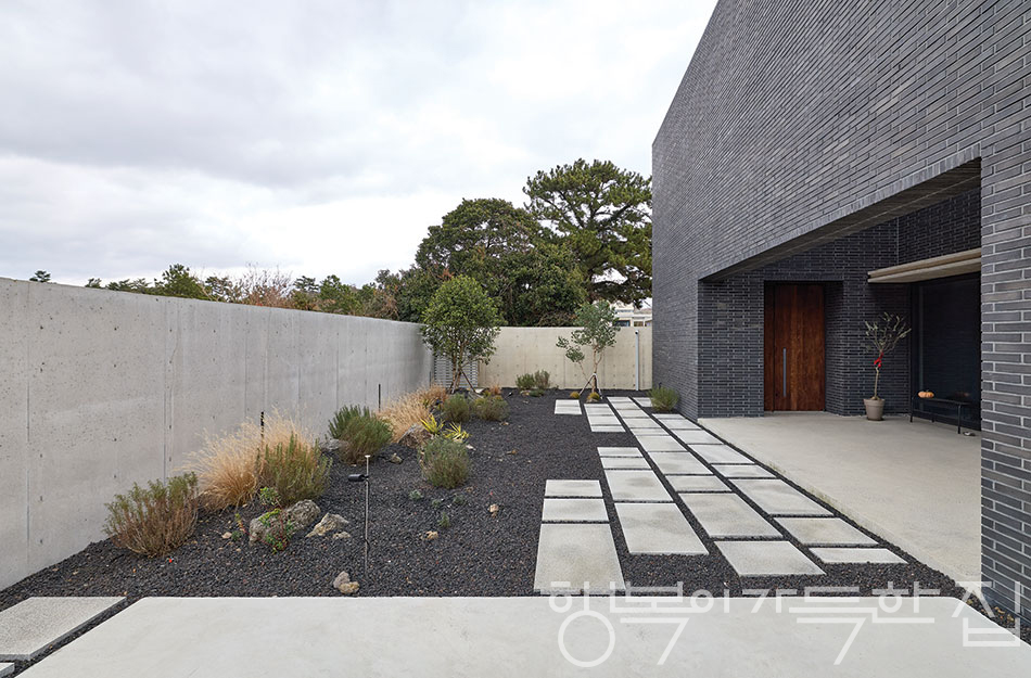 한 시간을 달려 도착한 집의 입지는 조금 과장해 말하면 프랑스의 어느 시골 마을에 온 듯한 분위기였다. 김창열미술관을 지나 잘 지은 단독주택에 들어선 몇몇 갤러리를 거쳐 저 안쪽에 부부의 집이 보였다. 양쪽으로는 드넓은 초지뿐. 택시에서 내리면 100m가량을 걸어 들어가야 하는 동선이었다. 검은색 벽돌로 쌓아 올린 견고한 사각 박스 형태의 집은 단정한 박력으로 아름다웠는데, 파사드에 창을 하나도 내지 않은 점이 인상적이었다. 한마디로 위풍당당한 집이었다.