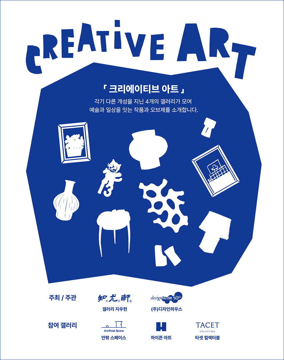 갤러리 지우헌은 제31회 서울리빙디자인페어에서 기획 부스 《CREATIVE ART》를 선보인다. 올 해 3회차 참여하는 본 부스에는 일상 속 예술의 가치를 조명하는 작품들로 구성된다. 협업 갤러리로 '안팎 스페이스(박주원&안재우 대표)', '하이픈 아트(한규진 대표)', '타셋 컬렉터블(심상윤 대표)'가 합류한다. 각기 다른 개성을 지닌 4개의 갤러리가 모여 예술과 일상을 잇는 작품과 오브제를 소개할 예정이다.