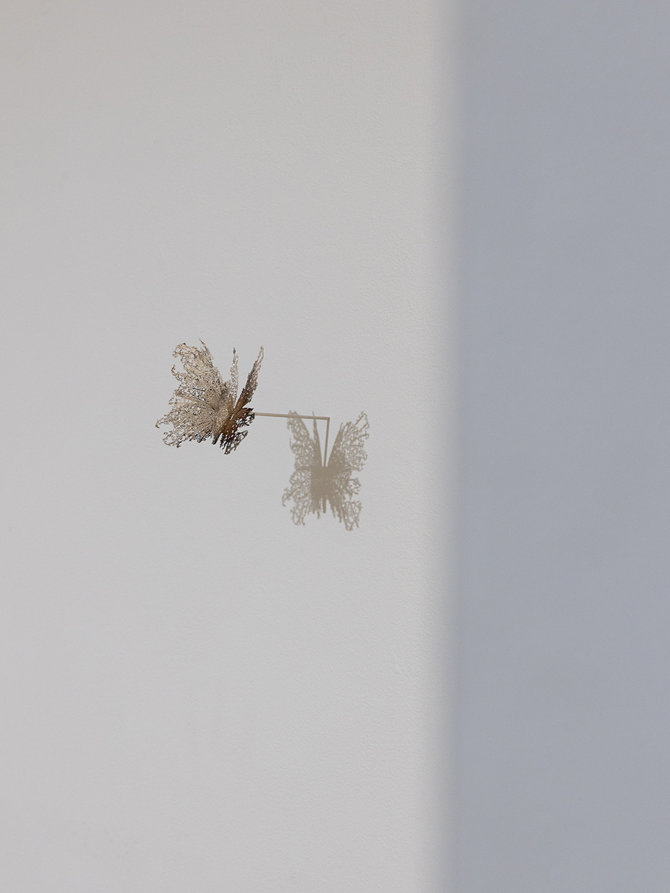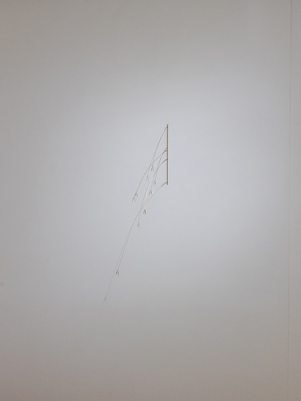 한편 김동해는 사물 자체보다 그것을 둘러싼 환경과 관계에 주목한다. 빛과 그림자, 바람, 중력처럼 눈에 잘 드러나지 않는 자연의 요소들이 작업의 출발점이다. 가느다란 금속선을 구부리고 연결해 만든 구조물들은 전시장 안의 공기 흐름에 따라 미세하게 움직이며 공간과 상호작용한다. 천장에서 나뭇가지처럼 바닥을 향해 늘어지는 〈고요(Stillness)〉는 단단한 금속이 보이지 않는 공기와 반응하는 흐름을 가시화하는 작품이다.