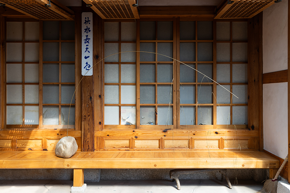 Landscape(quiet) and A Whisper of Wind — both made by fitting metal into natural stone — draw the surrounding negative space into the work through the minimum of line. As the artist likens it to the empty space in ink wash painting, the spare lines and open structures are the result not of adding, but of considering what to take away. His works are less finished objects than scenes — landscapes that only fully form when one stops, stands still, and looks.