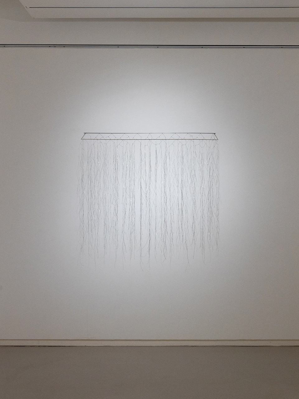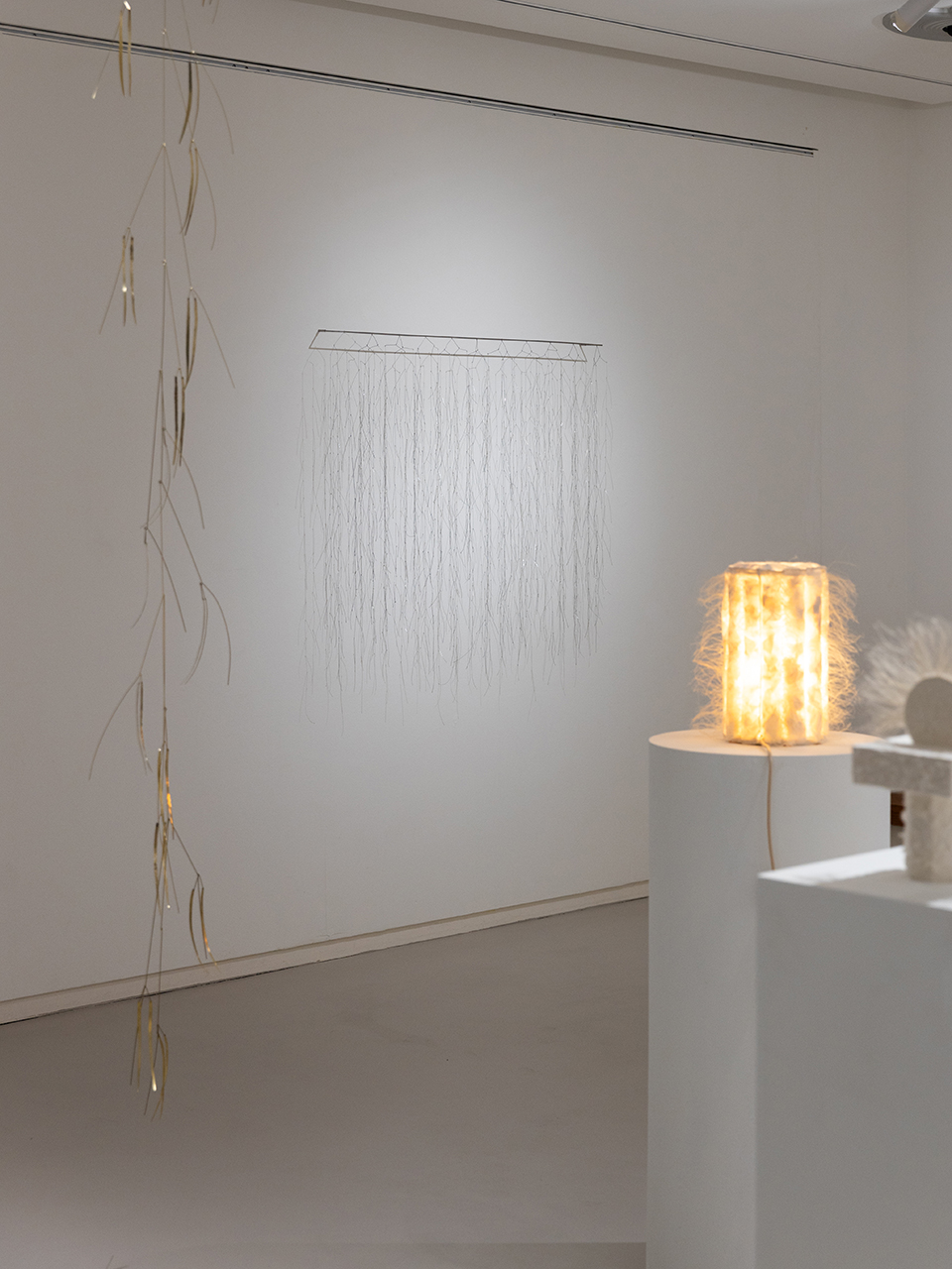 Kim Donghae, meanwhile, attends not to objects themselves but to the environments and relationships that surround them. Light and shadow, wind, gravity — natural forces that resist easy visibility — form the starting point of his practice. Structures made by bending and connecting fine metal wire move imperceptibly in response to the currents of air in the exhibition space, entering into dialogue with it. Stillness, which hangs from the ceiling and falls toward the floor like the branches of a tree, is a work that makes visible the way rigid metal responds to and traces unseen air.