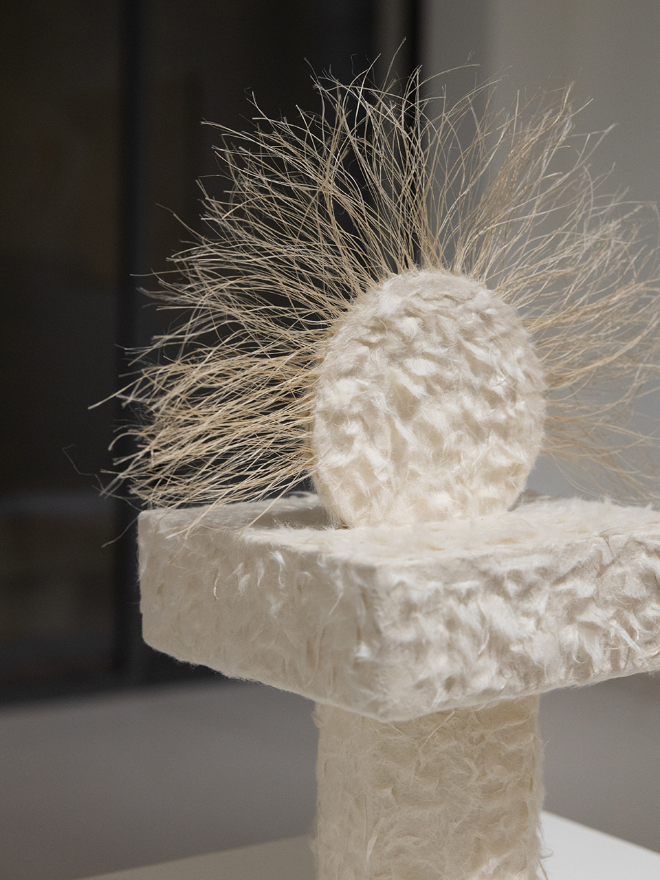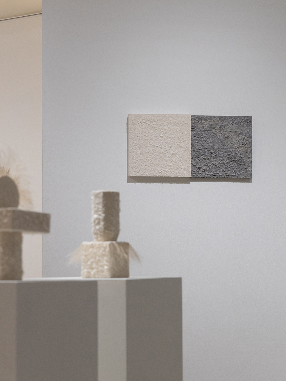 Lee Sun turns attention to materials and traces that have been pushed aside as valueless within the logic of rapid production and efficiency. Working primarily with traditional hanji, she builds her pieces through a process of layering, tearing, and breaking down — and in doing so, accepts the material's residual grain as part of the work itself. Totem, Feather Hanji — works in which the inner structure of hanji fibers is revealed through tearing — and Padding-Fur, assembled from leftover fragments gathered in the course of making, are pieces that embody this approach well. In the repeated act of gathering and accumulating what might otherwise be discarded or overlooked, the traces of time and labor are quietly deposited into the material itself.