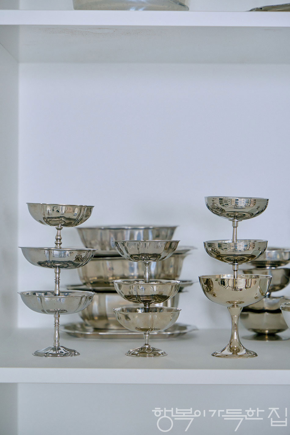 일본과 유럽 등 여행지에서 직접 발품을 팔기도 하고, 유럽 빈티지 마켓을 정기적으로 순회하는 셀러의 큐레이션이나 온라인 편집숍을 통해 컬렉션을 꾸준히 업데이트해왔다. 그렇게 모인 기물들 사이에는 4백만 원대의 라리크Lalique 빈티지 디캔터 아프로디테부터 사르게민Sarreguemines의 스테인리스&우드 퐁뒤 세트까지 폭넓은 스펙트럼이 공존한다. “제 취향이 이동해온 궤적을 기록하는 장소이기도 합니다. 화려한 프렌치 빈티지에 매료되던 시기를 지나, 지금은 실버와 아르데코 감성의 은그릇이 중심이 됐어요. 에르메스 재직 시절 경험한 하이엔드 실버웨어 브랜드 푸이포르카Puiforcat를 통해 실버의 매력에 깊이 빠져들었는데, 그 감각이 지금 제 취향과 완전히 맞물려 있죠. 지금은 국내에서도 흔히 볼 수 있게 되었지만, 사실 이것들은 트렌드로 자리 잡기 훨씬 이전부터 제가 직접 공들여 하나씩 수집해온 것들이에요.”