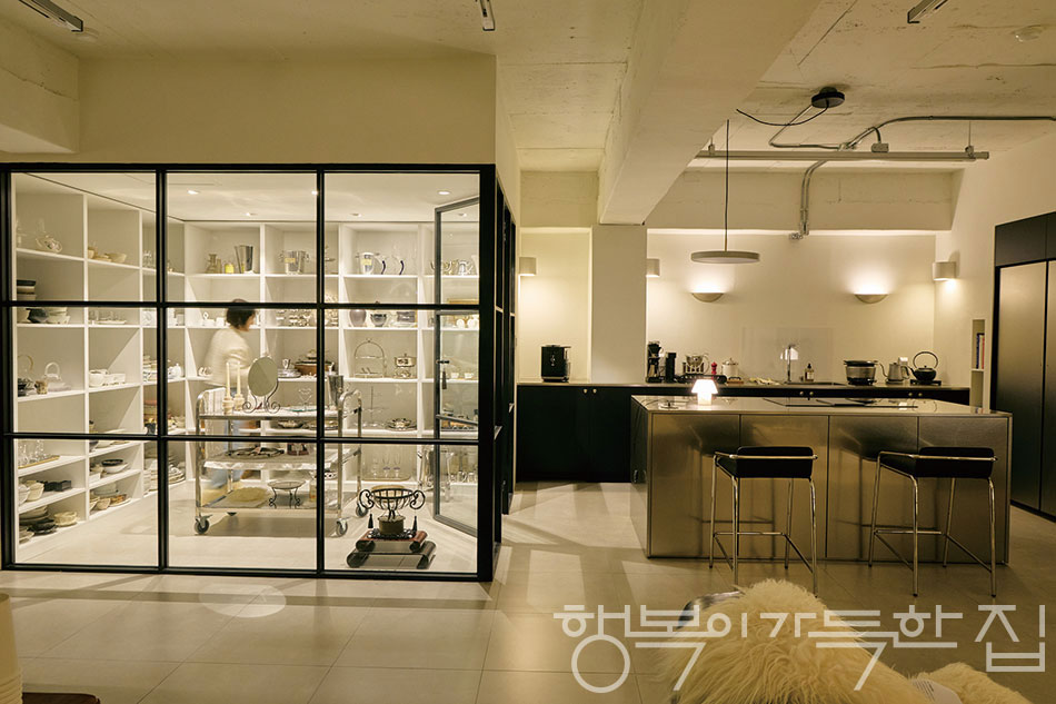 이 공간의 하이라이트는 직접 레노베이션한 키친과 8년 가까이 정성껏 수집해온 기물을 한데 모아둔 그릇 쇼케이스다.