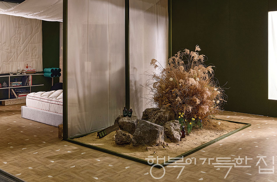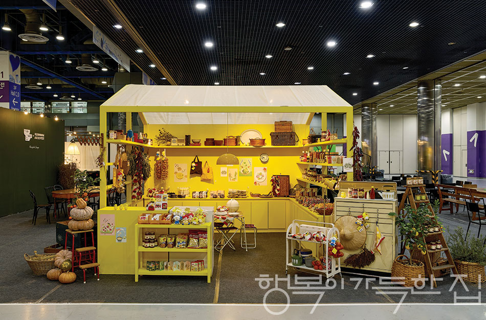 관람객이 파도처럼 쉴 새 없이 밀려오는 서울리빙디자인페어 전시장 길목에 마을이 하나 들어섰다. 김민지·김예진·김주암·박근하·양유완·최희승 인플루언서 6인의 취향이 담긴 집과 제철 식재료로 꾸린 오뚜기의 팜 키친, 카페 한남작업실이 모여 탄생한 <행복> 빌리지. 그 가옥들 사이로 도란도란 피어나온 마을의 풍경들.