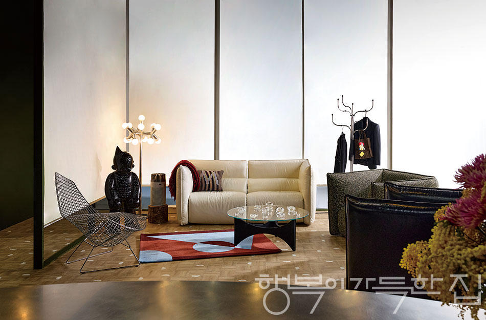 무제움 김예진 대표, 루밍 박근하 대표, 패션 스타일리스트 최희승의 취향이 담긴 리빙룸. 다채로운 조형과 물성이 ‘취향’이라는 지붕 아래 모였다. 이곳에서 가구와 가전은 단순히 기능을 수행하는 도구가 아니라, 에너지와 영감 및 상상력을 불러일으키는 존재다. 차가운 스틸 소재를 그물망 형태로 유연하게 엮어 강렬한 조형미를 보여주는 해리 버토이아의 체어 애시머트릭 셰즈, 로베르트 하우스만의 플로어 램프, 기하학 패턴이 인상적인 무제움의 러그, 무제움과 양유완 작가의 협업으로 완성한 한 점의 조형 작품 같은 테이블은 모두 무제움 김예진 대표의 소장품. 오른쪽 행어는 프리츠한센의 코트 트리로 루밍 박근하 대표의 소장품. 행어에 걸린 재킷은 패션 스타일리스트 최희승의 소장품. 소파 세 점은 알로소의 사티 컬렉션, 왼쪽 공기청정기는 다이슨의 허쉬젯 컴팩트 공기청정기. 그 옆의 아톰 오브제는 허명욱 작가의 작품.