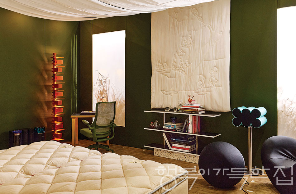 공예가 양유완, 루밍 박근하 대표, 패션 스타일리스트 최희승, 무제움 김예진 대표의 소장품이 모인 침실 겸 서재. 당대의 거장들이 궁극의 디자인을 위해 몰입한 시간까지 함께 담긴 가구와 조명, 아름다운 사물의 힘으로 채운 공간이다. 여기에 빛과 그림자, 온도, 향, 대화와 음악이 더해지면서 ‘나의 집’의 감각을 완성한다. 오른쪽에 실루엣처럼 자리한 의자는 가에타노 페셰의 빅 마마 체어. 가운데 무제움의 스트라타 셸프는 김예진 대표의 소장품. 선반 위 책은 스타일리스트 최희승의 소장품. 물방울 문진과 보틀 등 유리 오브제는 양유완 작가의 작품이자 소장품. 책 위 붉은 말은 양유완 작가가 붉은 말의 해를 기념하며 특별히 만든 반려 오브제. 오른쪽의 스피커는 발롱드파리의 오브젝트 6, 벽에 걸린 호랑이 무늬의 하얀 이불은 함창명주1481의 호작도 누빔이불, 천장에 늘어뜨린 패브릭은 함창명주1481의 한지 천. 왼쪽 의자는 베이셀의 뉴트렌디 하이, 조명은 야마기와의 탈리에신 2, 침대는 N32의 N32 모션 베드, 왼쪽의 가전은 다이슨의 스팟앤스크럽 Ai 로봇 청소기와 허쉬젯 컴팩트 공기청정기.
