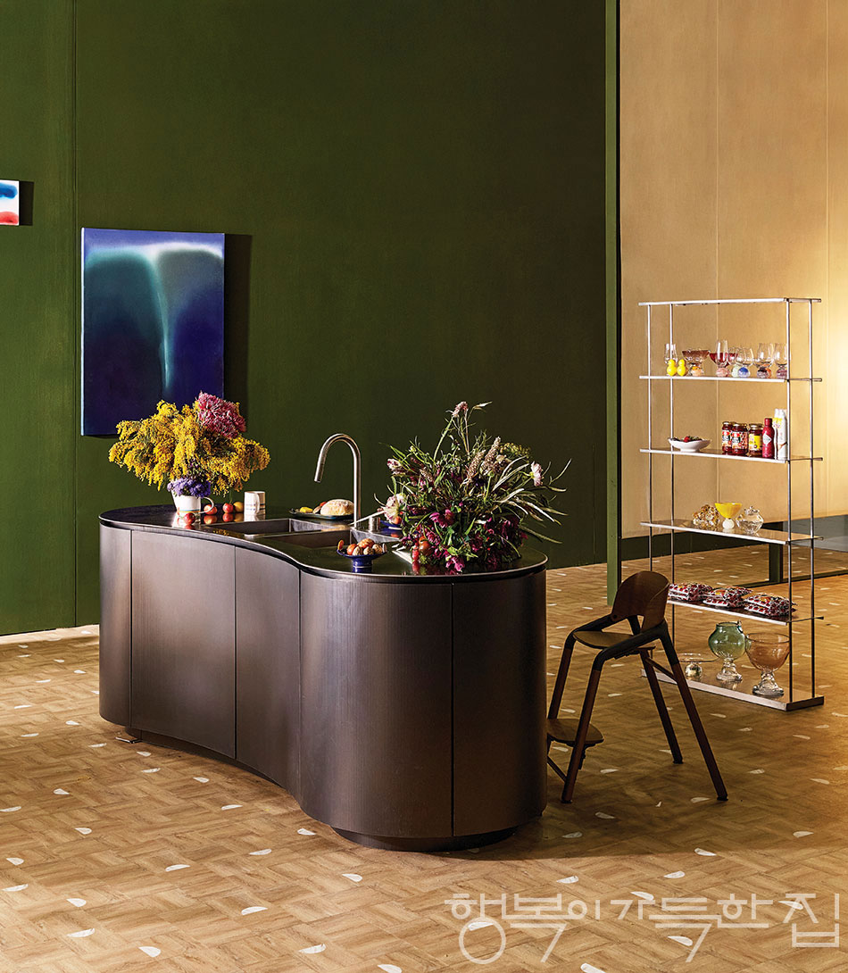 싱크대 위 다이닝 신은 김민지 디렉터가 ‘손으로 만들어지는 것들이 모여 있을 때의 따뜻한 장면’을 상상하며 직접 연출했다. 벽에 걸린 페인팅과 싱크대 위 도자 그릇은 이나영 작가의 작품으로 김민지 디렉터의 소장품. 꽃은 박지나 작가의 작품. 오른쪽 선반은 무제움의 레이어드 스틸로 김예진 대표의 소장품. 벨 글라스, 와인 칠러 등 투명한 물성과 색감이 조화를 이루는 유리 오브제는 양유완 작가의 작품이자 소장품. 소스와 하얀 접시는 모두 오뚜기. 싱크대는 백조씽크의 라운드 5T 가구장, 의자는 부가부의 부가부 지라프 하이체어.