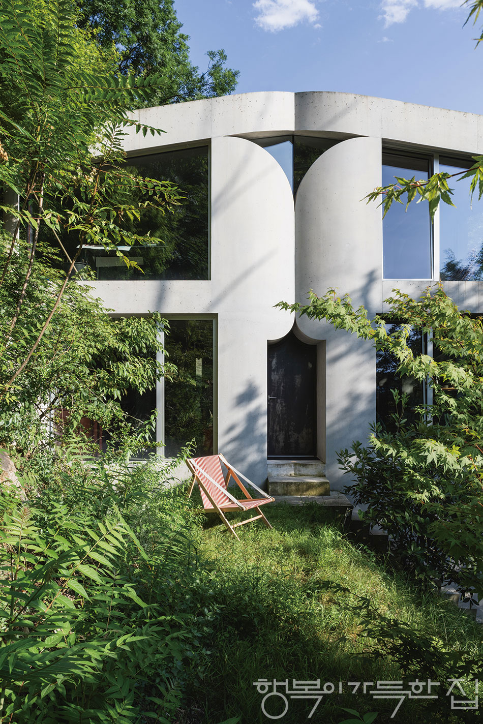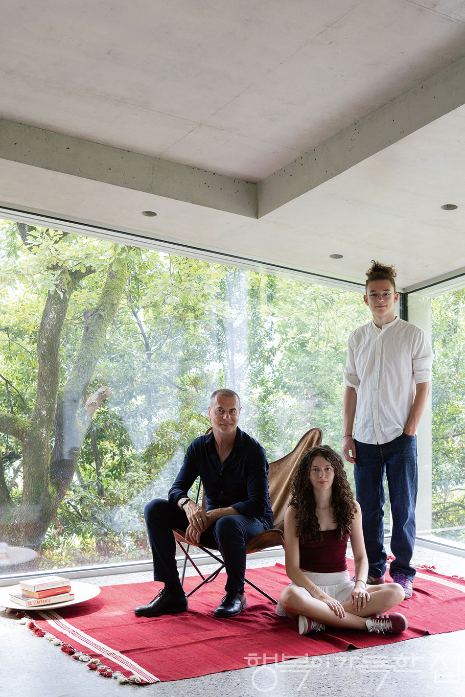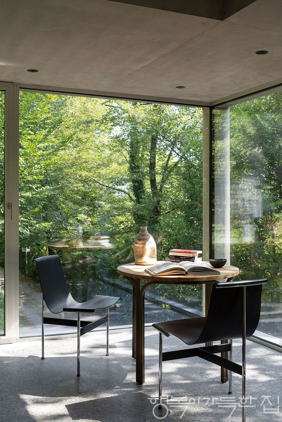 유리창 너머로는 계절에 따라 표정을 바꾸는 숲이 펼쳐진다. 봄에는 연둣빛 잎이 창을 가득 채우고, 여름에는 짙은 녹음이 집 주변을 감싼다. 가을이 되면 나뭇잎이 붉거나 황금빛으로 물들며 풍경의 색을 바꾸고, 겨울에는 잎이 떨어진 나무의 실루엣만 남아 건축 형태와 더욱 또렷하게 겹쳐진다. “건축은 단번에 시선을 사로잡는 대상이기보다 시간이 흐르면서 점점 더 많은 것을 보여주는 존재여야 합니다. 오래 바라볼수록 새로운 표정이 드러나는 풍경 같은 건축을 만들고 싶었습니다.” 이 집에서 건축은 자연을 지배하려 하지 않는다. 숲과 바위 사이에 조용히 머물며 그 풍경과 시간을 함께 견딘다.