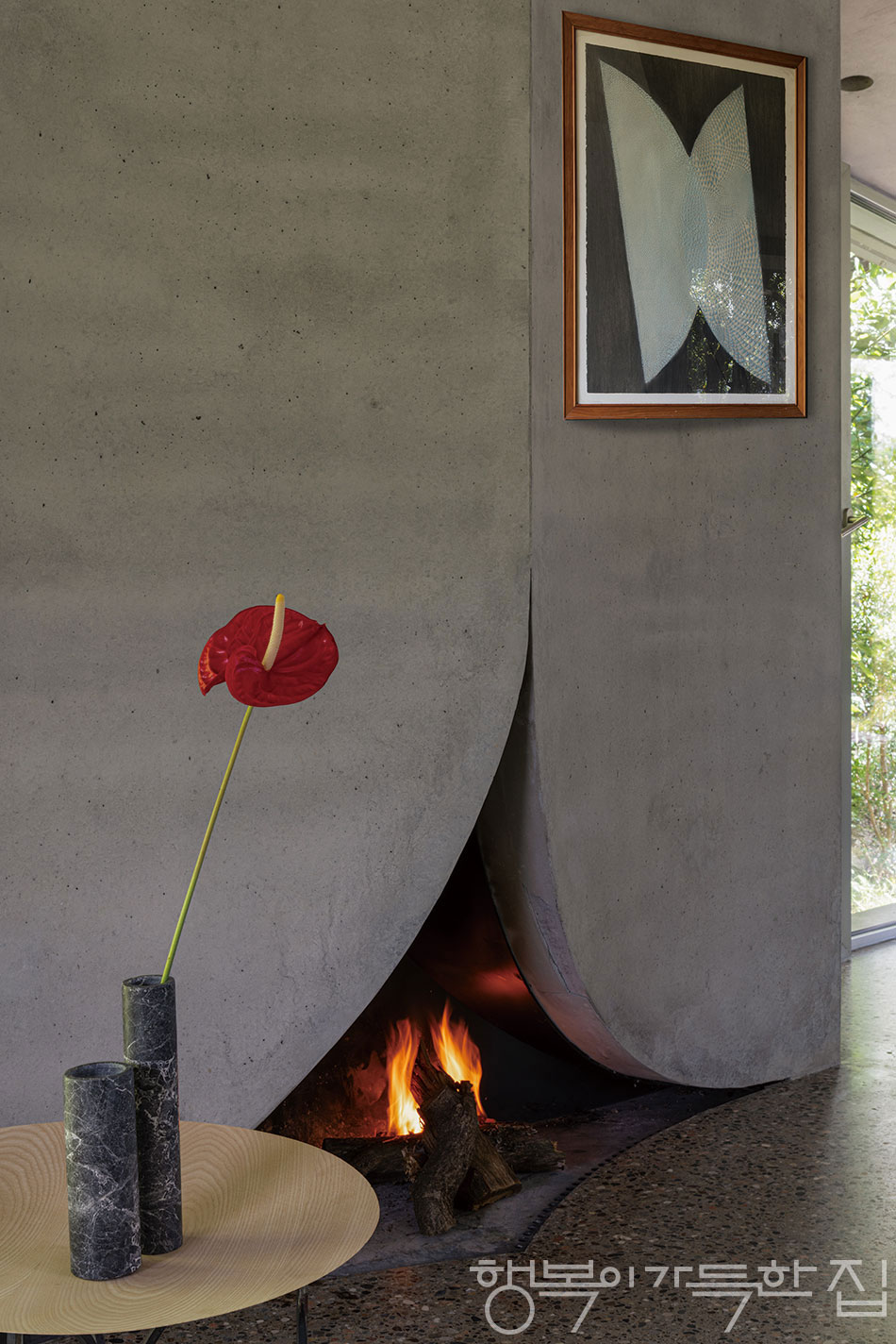 벽난로와 함께 집 전체에 반복되는 굽은 아치 형태가 마치 무대배경 같은 효과를 낸다. 벽난로 위에는 아르투르 루이스 피자Arthur Luiz Piza의 작품이 걸려 있다. 오른쪽 아래에는 스튜디오 첼로리아Studio Celoria의 사이드 테이블과 라보라토리 밀라노Laboratory Milano의 히드리아 대리석 화병이 놓여 있다.