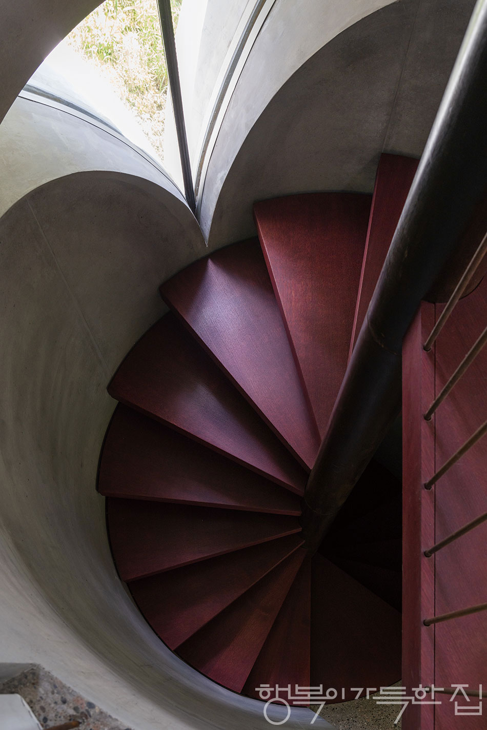 계단 공간 디테일. 보르도 에나멜 마감 목재로 만든 나선형 구조가 특징이다.
