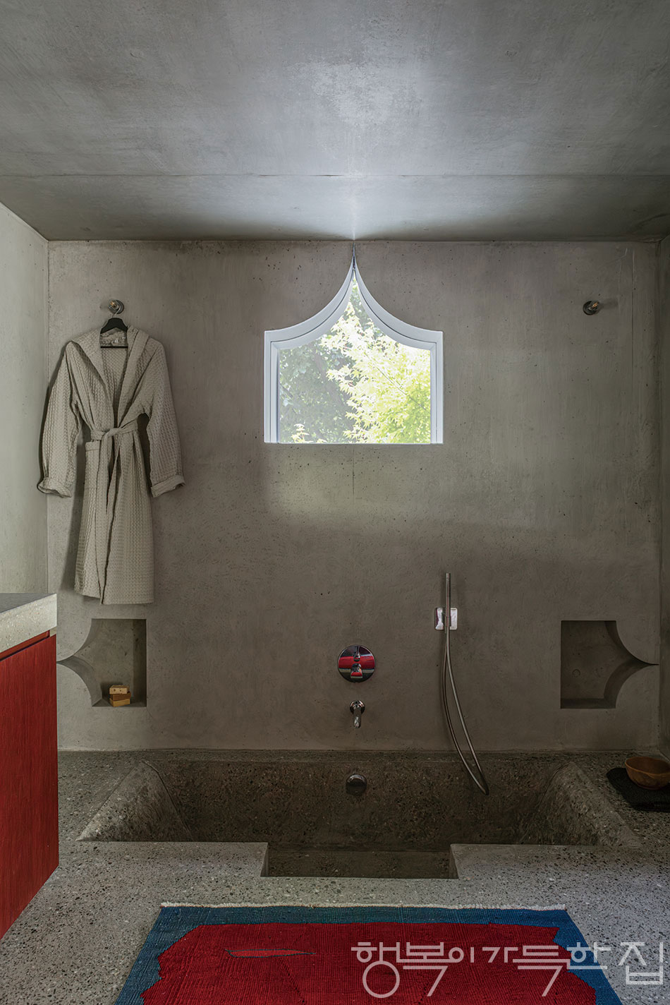 계단을 따라 아래층으로 내려가면 침실이 있는 공간이 펼쳐진다. 그 사이에는 미로의 중심처럼 비어 있는 공간이 하나 있다. 어느 문을 열지 잠시 멈춰 생각하게 만드는, 다소 추상적인 장소다. 침실은 최소한의 가구와 단순한 형태로 구성했다. 자연광은 커튼을 거쳐 부드럽게 들어오며 풍경과 실내를 자연스럽게 이어준다. 공간의 색은 앤트러사이트(짙은 흑회색), 토프taupe(회갈색), 오커ochre(황토색), 같은 자연색을 기본으로 하고, 러그와 문에서 다시 보르도색이 포인트처럼 등장한다. 욕실은 조용한 하맘hammam(중동·터키식 공중목욕탕)을 떠올리게 하는 분위기다. 바닥에 낮게 자리한 욕조와 벽을 파낸 니치, 매트한 콘크리트 표면이 어우러지며 물과 빛이 만드는 차분하고 명상적인 공간을 완성한다.
