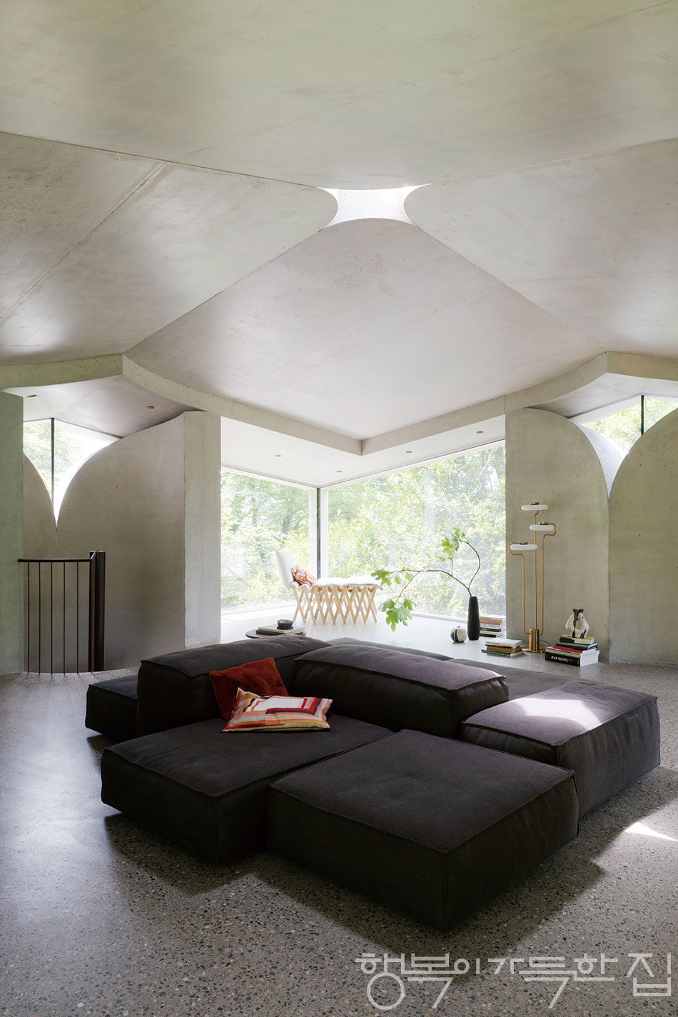 “욕실을 단순한 기능 공간으로 생각하지 않았습니다. 물과 빛, 그리고 재료가 만나는 순간이 하나의 의식처럼 느껴지는 장소가 되기를 바랐죠. 그래서 이 공간은 최대한 조용하고 밀도 있게 설계했습니다.” 집의 맨 위층은 건축가가 ‘꿈의 공간’이라 부르는 곳이다. 사방으로 숲을 바라보는 3백60도의 거실이 펼쳐진다. 지붕은 주변 구조점 네 개가 지지하고, 콘크리트 형태는 모두 중앙의 천창으로 모여든다. 그곳에서 떨어지는 빛은 공간을 거의 성소처럼 느껴지게 만든다. 한쪽에는 구조와 하나처럼 이어진 벽난로가 자리하고, 거실 중앙에는 깊이감 있는 소파가 놓여 있다. 주변에는 슬림한 플로어 조명과 간결한 스툴, 그리고 가벼운 라운지체어가 더해져 절제된 풍경을 완성한다.
