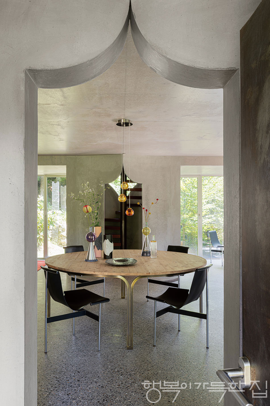 1층 현관에서 바라본 다이닝 공간. 모든 개구부에 반복되는 굽은 아치 형태는 이 집의 디자인 아이콘으로, 빛과 그림자 및 채움과 비움의 경계를 만드는 돌 문턱처럼 작동한다. 스튜디오 첼로리아가 디자인한 목재와 스틸 소재의 다이닝 테이블 위에는 라보라토리 밀라노의 변형 가능한 화병 컬렉션과 엘리아나 델라 스피나의 라쿠 세라믹 접시가 놓여 있다. 주변에는 1950년대 빈티지 미드센추리 T 체어 네 점이 배치되었으며, 천장에는 테르차니Terzani의 미주 블로운 글라스 펜던트 조명이 설치되었다.
