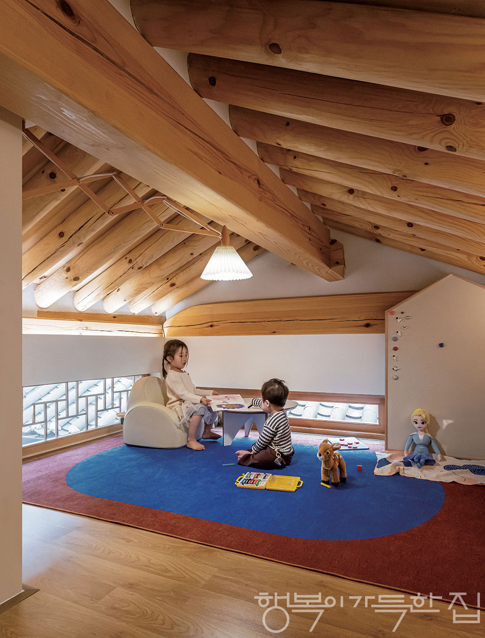 아이가 한 명에서 두 명으로 늘었지만 희진 씨가 집 안에 꼭 두고 싶던 것은 변함없었다. 바로 다락방이다. “어릴 적 할머니 댁 다락에 올라갈 때 추억이 있어요. 마치 비밀의 장소로 향하는 기분이었달까요? 설레기도 하면서 무섭기도 하던 그 추억이 지금까지도 머릿속에 선연히 남아 있어요. 그 경험을 딸 은서에게도, 아들 해준이에게도 선사하고 싶었죠.”