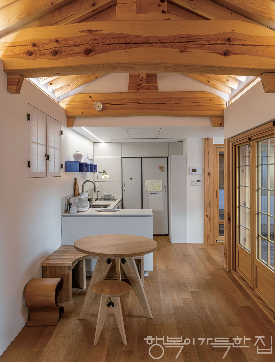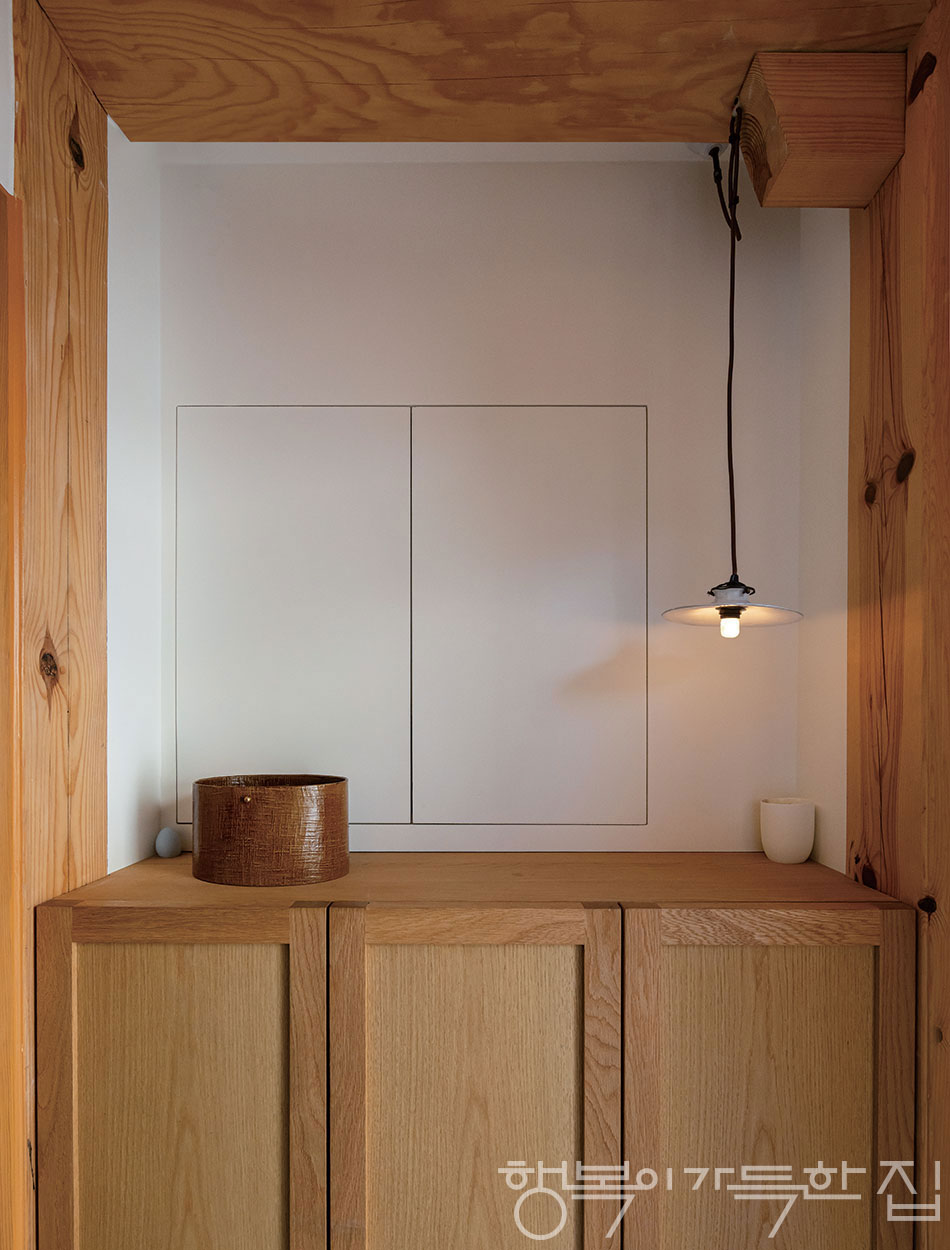 부부와 자녀가 복작거리며 살아갈 한옥은 어느 한 곳도 허투루 쓸 수 없었다. 네 가족이 옹기종기 모여 함께 자고 일어나는 안방의 경우, 면적의 일부를 드레스룸으로 할애했다. 여기에 두 개의 문을 내어 한 쪽은 안방에서, 또 한쪽은 대청에서 출입이 가능하게 했다. 이른 아침 출근하는 남편이 꿈나라에 있는 아이들의 잠을 깨우지 않고 옷을 갈아입을 수 있도록 고려한 부분이다. 부엌 천장 위에는 사다리를 달고 자주 쓰지 않는 짐을 적재할 수 있는 수납공간을 마련했다. 부부의 책, 아파트에 걸려 있던 큼지막한 그림들, 안 쓰는 전자 기기들을 세모 천장 속에 숨겨두었다.