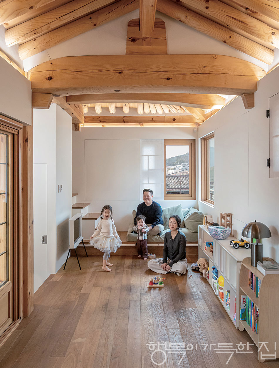 먼저 다락으로 올라가는 동선과 형태를 고민했다. 사다리 형태의 계단을 설치하는 건 아이의 안전을 생각할 때 다소 위험할 수 있었다. 계단을 최대한 완만하게 만들고자 단의 개수를 줄이기로 했다. 또한 다락방 공간을 확보하기 위해 네 가족이 함께 자고 함께 일어나는 안방의 단을 낮췄다. 다락방과 지층을 이어주는 계단 사이에는 대청 바닥을 한 단 올려 수납함이자 온 가족이 모여 앉는 벤치를 마련해 집 안의 중심을 잡았다.