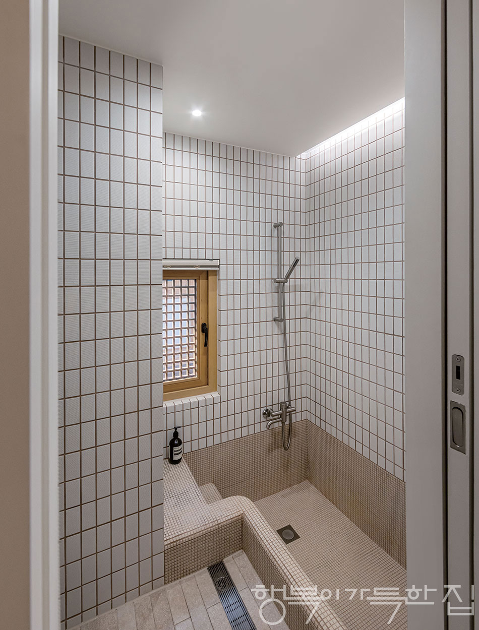 희진 씨는 어릴 적 부모님과 함께 목욕놀이를 하던 기억을 떠올리며 추억을 만들 수 있는 욕실 또한 원했다. 엄현정 소장은 부모와 아이들이 함께 물놀이를 즐길 수 있도록 욕실에는 욕조만 두고, 다른 기능은 별도로 분리했다. 욕조의 경우 모서리 없이 둥글게 처리해 안전을 고려했고, 아이가 편히 앉아서 씻을 수 있도록 욕조 안에 자그마한 계단도 만들었다. 타일의 경우 내구성도 좋고, 오염에도 강한 타일을 고르는가 하면, 줄눈에는 브라운색을 넣어 공간에 따뜻하고 밝은 무드를 조성했다. 세면대 또한 컬러감을 주어 두 아이에게 씻는 행위 자체가 놀이의 연장선처럼 됐으면 하는 마음을 담았다.