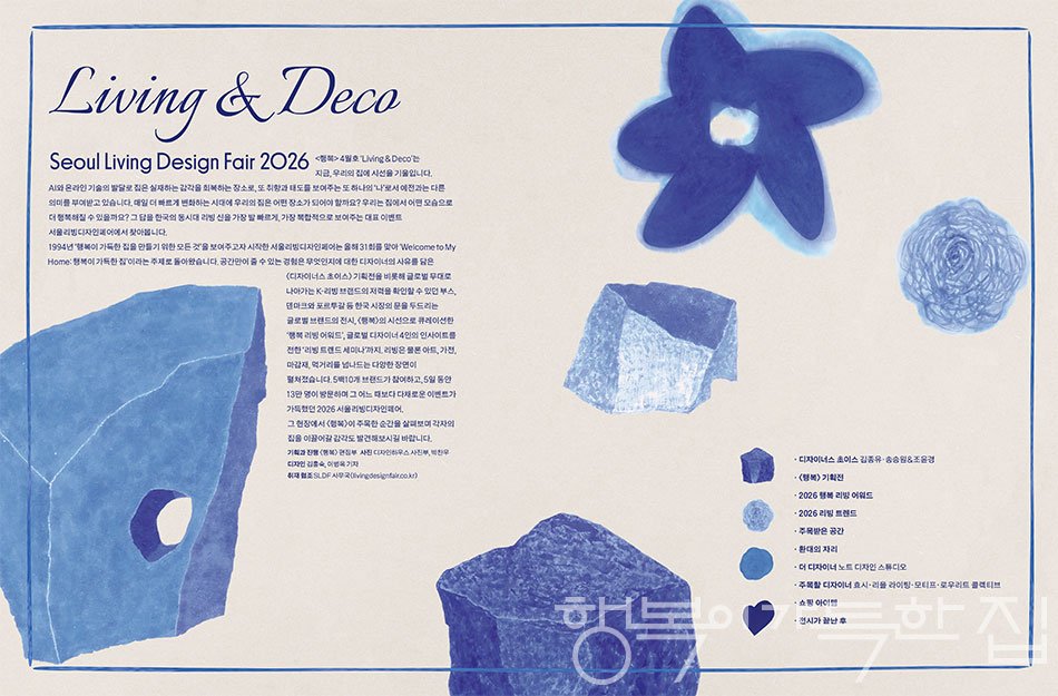 <행복> 4월호 ‘Living & Deco’는 지금, 우리의 집에 시선을 기울입니다. AI와 온라인 기술의 발달로 집은 실재하는 감각을 회복하는 장소로, 또 취향과 태도를 보여주는 또 하나의 ‘나’로서 예전과는 다른 의미를 부여받고 있습니다. 매일 더 빠르게 변화하는 시대에 우리의 집은 어떤 장소가 되어야 할까요? 우리는 집에서 어떤 모습으로 더 행복해질 수 있을까요? 그 답을 한국의 동시대 리빙 신을 가장 발 빠르게, 가장 복합적으로 보여주는 대표 이벤트 서울리빙디자인페어에서 찾아봅니다. 1994년 ‘행복이 가득한 집을 만들기 위한 모든 것’을 보여주고자 시작한 서울리빙디자인페어는 올해 31회를 맞아 ‘Welcome to My Home: 행복이 가득한 집’이라는 주제로 돌아왔습니다. 공간만이 줄 수 있는 경험은 무엇인지에 대한 디자이너의 사유를 담은 〈디자이너스 초이스〉 기획전을 비롯해 글로벌 무대로 나아가는 K-리빙 브랜드의 저력을 확인할 수 있던 부스, 덴마크와 포르투갈 등 한국 시장의 문을 두드리는 글로벌 브랜드의 전시, 〈행복〉의 시선으로 큐레이션한 ‘행복 리빙 어워드’, 글로벌 디자이너 4인의 인사이트를 전한 ‘리빙 트렌드 세미나’까지. 리빙은 물론 아트, 가전, 마감재, 먹거리를 넘나드는 다양한 장면이 펼쳐졌습니다. 5백10개 브랜드가 참여하고, 5일 동안 13만 명이 방문하며 그 어느 때보다 다채로운 이벤트가 가득했던 2026 서울리빙디자인페어. 그 현장에서 〈행복〉이 주목한 순간을 살펴보며 각자의 집을 이끌어갈 감각도 발견해보시길 바랍니다.