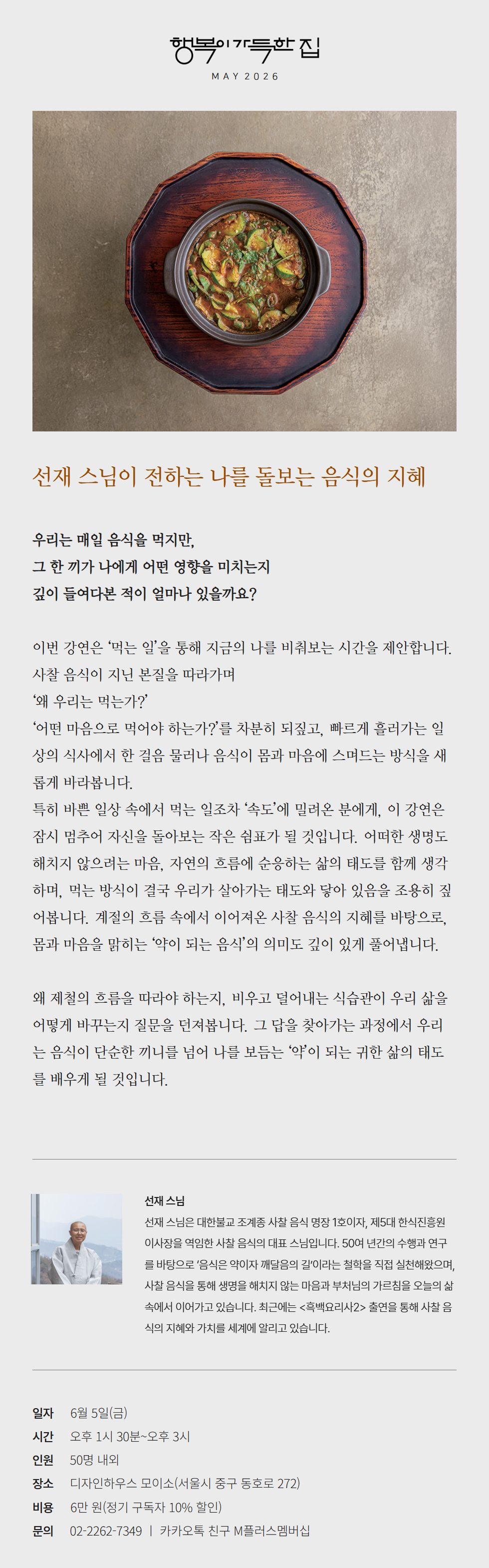 먹는 일을 통해 나를 비춰보고, 몸과 마음을 맑히는 사찰 음식의 지혜를 만나보세요. (모집기간: 2026.04.20~06.04까지)