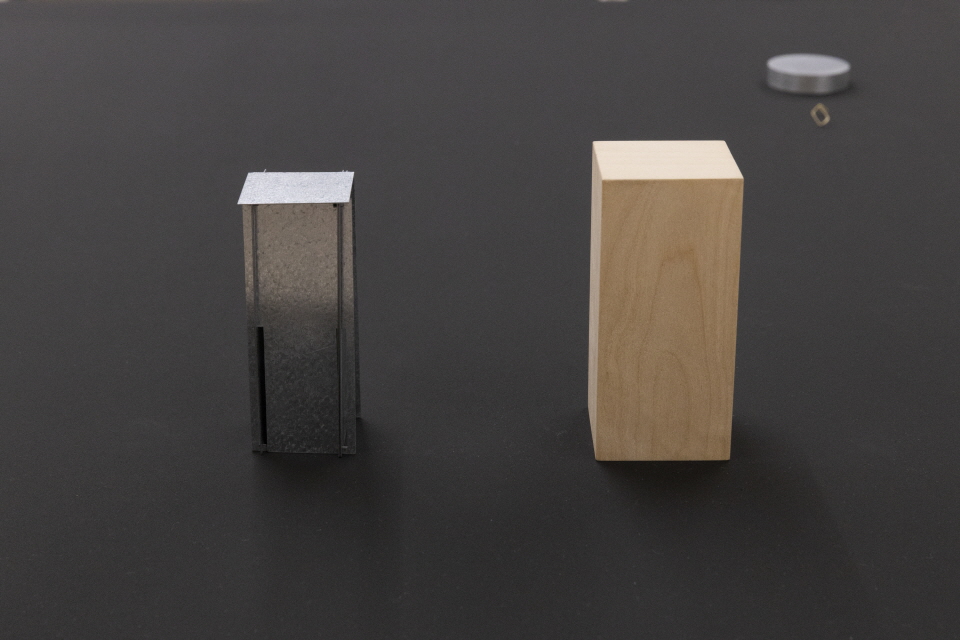 Jung Junwon, box (brooch), 2019. Galvanized-steel, wood, 4 x 4 x 10 cm