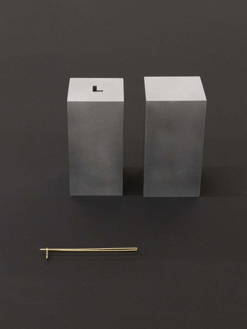 Jung Junwon, pins (earrings), 2019. Gold(18K), zinc, 4 x 4 x 10 cm
