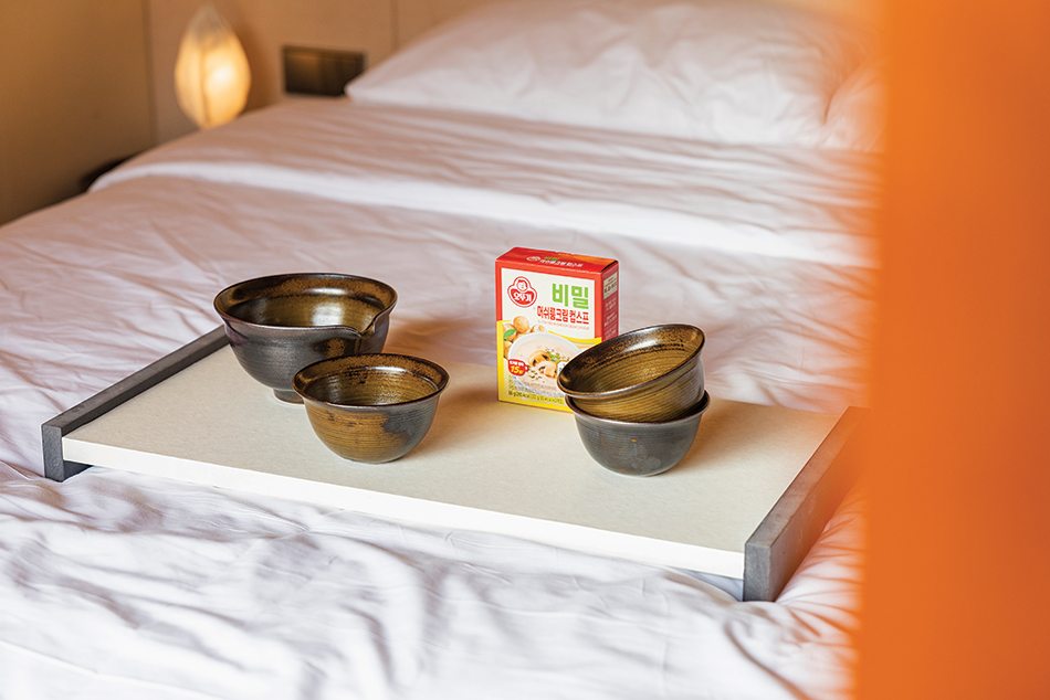 아래채에서는 국내 첫 스프 제품인 산타 크림스프부터 지금에 이르기까지 스프의 역사와 변화를 조명하고, 위채에서는 작가들의 그릇을 원래 그 자리에 있던 듯 한옥 곳곳에 자연스레 전시했다. 관람객은 그릇의 형태와 먹는 방식을 살피고, 어떤 스프와 어울릴지 이야기를 나누기도 하며 하나하나 관심을 기울였다. 작가, 셰프 등 네 명의 인물을 도예가와 매치해 각자의 스프 생활에 맞는 그릇을 만든 것도 이번 프로젝트에 보다 몰입하게 한 포인트. 한정용 교수는 초등학생 아들이 직접 나누고 덜어 먹는 즐거움을 느낄 수 있도록 나눔 그릇과 한 손에 잡히는 스프 볼로 구성한 세트를 제작했고, 유희송 도예가는 스프 볼과 빵이나 샐러드를 곁들여 먹을 수 있는 플레이트를 준비해, 잠깐의 식사 시간도 나를 보살피는 순간으로 즐기는 무과수 작가의 스프 생활을 함께 채웠다.