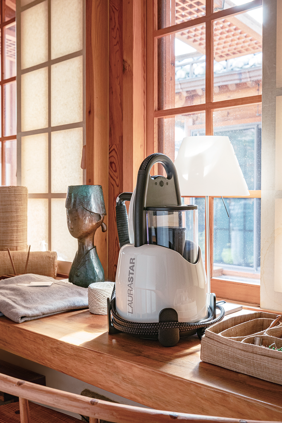 로라스타 리프트 스팀다리미, 고소미 작가의 소미사와 작업 도구, 마레디마리의 캐시미어 의류을 두어 작업실 같은 풍경을 연출했다.