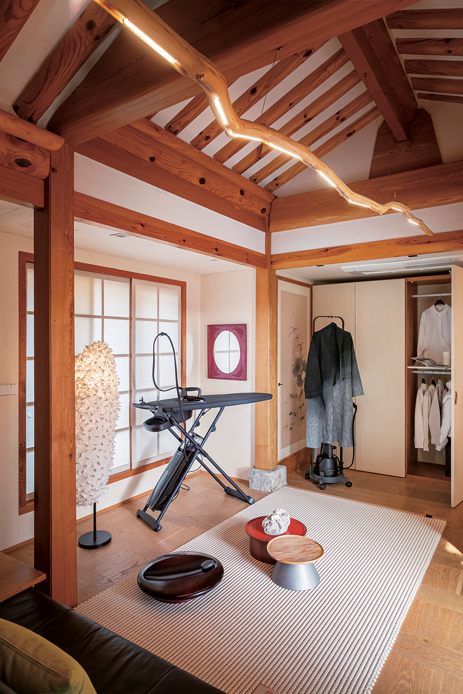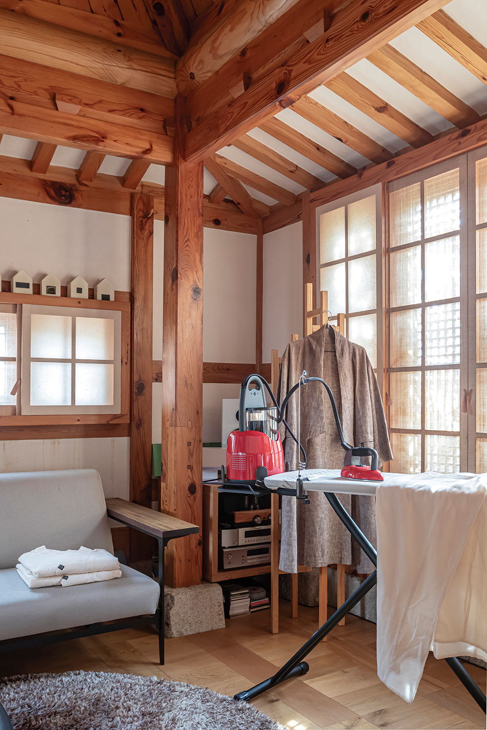 이번 행복작당 기간에는 일상이 깃든 고즈넉한 한옥에 스위스 브랜드 로라스타가 함께했다. 1980년 설립된 로라스타는 옷을 아름답고 위생적으로 관리할 수 있는 독자적인 스팀 기술을 보유한 브랜드다. 단순히 옷을 잘 다림질하는 데 그치지 않고 초미세 건식 스팀 기술(DMS)로 어떤 옷감도 손상 없이 정교하게 관리하며, 패브릭 가구와 직물도 깨끗하게 유지한다. 전시 스타일링을 담당한 세븐도어즈 민송이 대표는 이러한 기술과 현대적 디자인을 갖춘 로라스타의 제품이 한옥의 정취 속에 자연스럽게 녹아드는 풍경을 연출했다. 여기에 한지와 리넨 등 전통 직물과 섬유를 탐구하는 고소미 작가의 작품을 더해 화룡점정을 이뤘다.