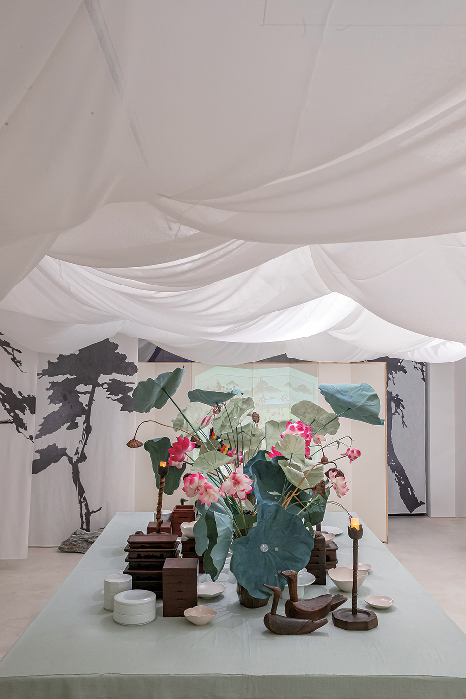 고임상과 합, 궁중채화는 예로부터 잔칫상의 주인공으로, 풍요와 복을 기원하고 존중을 표현하는 상징이었다. 민송이 대표는 그러한 의미를 지닌 존재를 하나둘 모아 <행복>의 잔칫상을 완성했다. 음식을 높이 쌓아 존경의 뜻을 전하던 고임상은 제철 재료의 맛과 향을 한 입 크기에 응축한 흑유재의 양갱으로 표현했고, 찬합에 담긴 정성을 쌓는다는 의미는 해인요의 합과 고족접시, 한국고미술협회의 고미술품을 층층이 얹어 구현했다. 연꽃을 닮은 광주요 접시를 비롯해 아름다운 기물이 놓인 상 위로는 국가무형유산 궁중채화 기능보유자 최성우가 설립한 궁중채화서울랩의 궁중채화 ‘연꽃’이 드리워졌다. 비단 위에 수백 번의 붓질을 겹겹이 쌓고, 말리고, 다시 색을 입히는 과정을 반복하며 완성하는 채화는 그 자체로 정성의 예술이자 잔치의 정점을 이루는 존재다. 채화와 함께 더욱 풍성해진 잔칫상의 가장자리에는 소반을 여러 개 두고 채화를 꽂은 화병을 올렸다. 잔치가 끝나면 임금이 음식을 나눠주던 ‘사찬賜饌’의 모습을 현대적으로 재해석해 함께 나누는 기쁨을 담은 것. 잔치의 피날레는 고소미 작가가 먹이 배어든 광목을 겹겹이 쌓아 올린 작품 ‘시간의 탑: 축복의 잔(The Tower of Time: Cup of Blessing)’이 장식했다.