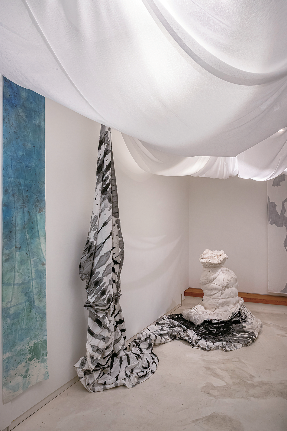 “제 작업은 먹이 배어든 광목을 겹겹이 접어 탑처럼 쌓아 올리는 행위를 통해 삶의 희로애락을 담아내며 ‘단단한 내면’을 구축하는 여정을 시각화합니다. 행복 역시 매일의 성찰과 의식적인 긍정의 경험, 때로는 고독하고 치열한 시간을 통과하며 찰나의 순간을 수없이 쌓아 올려야 비로소 완성되는 ‘내면의 건축물’과 같습니다. 행복작당이 10년 동안 쌓아 올린 잔칫상의 화려함 뒤에 숨은 노력과 정성을 지지하고, 앞으로 더욱 가득 채워질 새로운 행복을 기원하는 마음을 담았습니다.” _고소미 작가