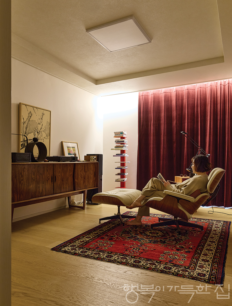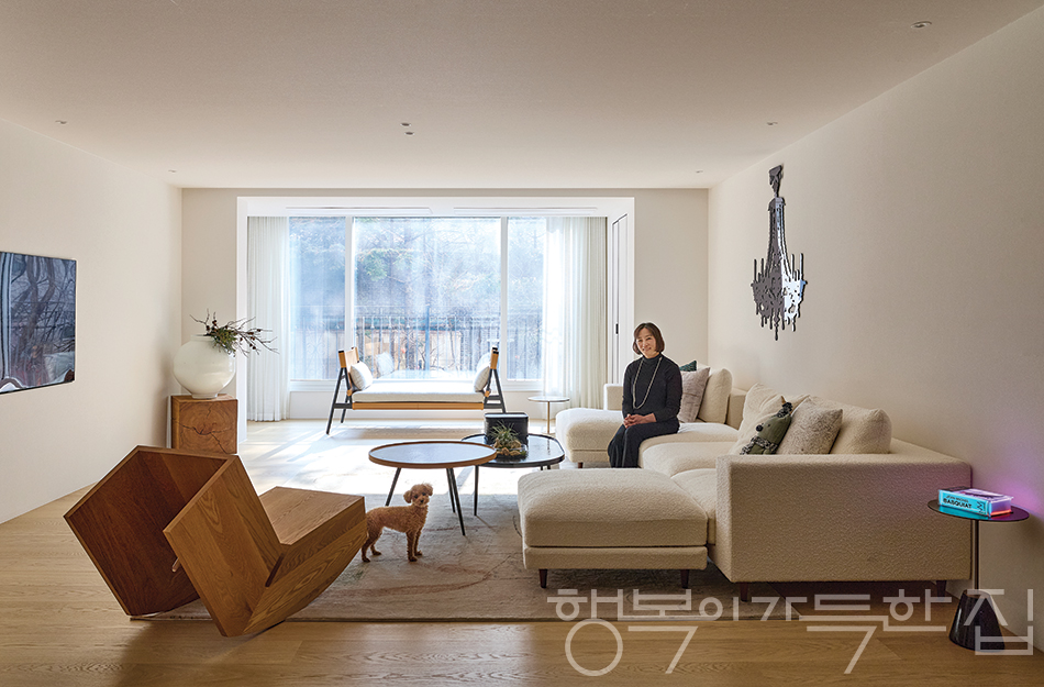 “본질은 이겁니다. 가장 잘 꾸민 집을 보여주는 일이 아니라, 사업가로 27년을 살아온 방식이 어떤 결로 정리되었는지를 나누는 것. 한때 꽉 채운 공간이 주는 활기를 즐겼지만, 지금은 나를 오래 지탱해줄 기능과 안락함이 먼저가 되어야 한다고 생각합니다. 인생의 후반전을 단단하고 편안하게 지켜줄 구조에 대한 신뢰와 갈망이 있습니다. 끝끝내 우리에게 필요한 건 많지 않더라고요. 소파와 라운지체어, 넉넉한 크기의 테이블만 있어도 충분하다고 여겨질 때가 많습니다. 이건 취향의 후퇴나 에너지의 소멸이 아니에요. 삶의 균형감을 위한 전략적이고 진심 어린 선택입니다. 카펫부터 가구까지 여러 브랜드를 소개하지만, 집이 쇼케이스가 되는 건 원치 않습니다. 실험실이 되는 것도요. 그 때문에 오랫동안 검증된 것들로만 채웠습니다. 그림도 다 걸지 않았고요. 더 많이 가지는 삶에서 더 잘 사는 삶, 더 오랫동안 편안한 삶으로 생각의 무게중심이 바뀌었습니다.”