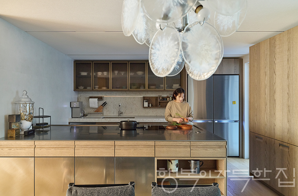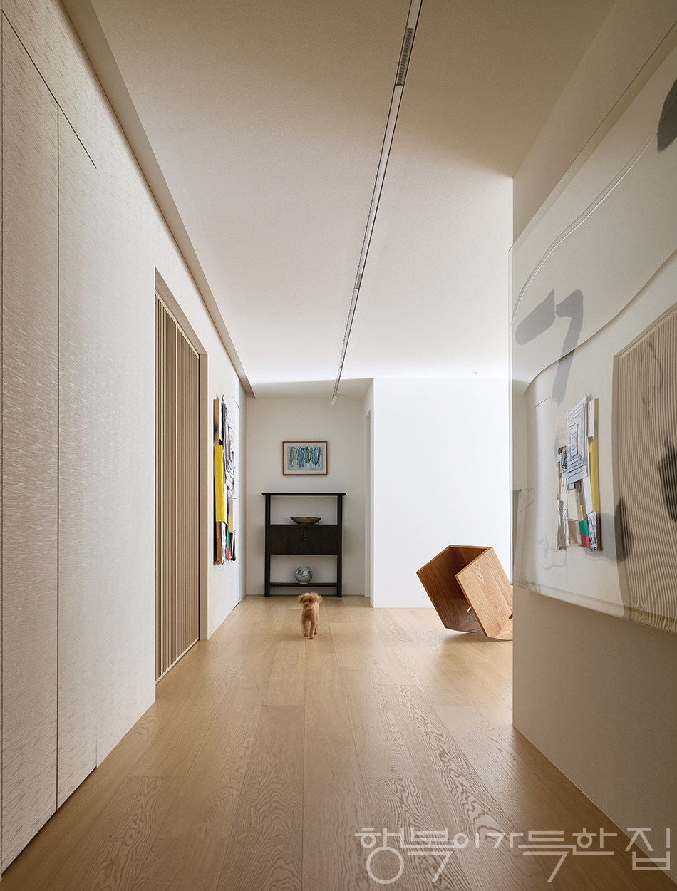 “함께 회사를 만들었으니 제게도 경험 데이터가 필요했어요.(웃음) 모든 진행 상황과 의사 결정이 현장 사진과 함께 전용 앱으로 이루어지다 보니 와볼 필요가 없겠더라고요. 가장 신경 쓴 건 네 가지예요. 동선이 편안하고, 수납이 충분하며, 벽장 같은 마감재의 표면이 깨끗하게 유지되고, 시간이 지나도 흐트러져 보이지 않을 것. 더 편안하고, 더 단정한 집의 시간을 원했기 때문에 특히 수납에 신경을 많이 썼어요. 수납으로 삶이 바뀌었다고 해도 과언이 아니에요. 책을 많이 읽는데, 평소에는 안 보였으면 해서 별도의 책장을 따로 만들어 다 숨겨놓았지요. 암막 커튼은 모두에게 추천하고 싶은 아이템이에요. ‘어둠의 가치’라는 게 분명히 있더라고요. 눈에 보이는 스타일보다 살아보며 느끼는 편안함이 우선이라는 것도 절감했습니다. 대대적 변화를 준 곳은 주방이에요. 유앤어스에서 수입하는 아크리니아를 들여왔거든요. 조리 공간도 넓고, 공간 디자인도 정교하게 짜임새가 있고, 스테인리스와 나무로 만든 유닛들이 그 자체로 하나의 건축물 같아서 요리를 더 자주 하게 돼요. 반복해서 하는 이야기인데, 시각적 화려함보다는 편안한 바탕을 만들기 위해 노력했어요. 공간이 견인하는 회복 탄력성도 분명히 있거든요.” 아티스트 허명욱은 테이블웨어와 옻칠 회화에 워낙 다양한 색을 쓰는 까닭에 작업실의 모든 가구와 조명을 검은색으로만 들여놓는 것으로 유명하다. 옷도 검은색만 입는다. 그렇게 바탕을 검은색으로 통일했을 때 다른 색이 더 생생하고 감각적으로 와닿기 때문인데, 백명주 대표의 바탕을 만드는 작업도 이와 같은 맥락이 아닐까 싶다.
