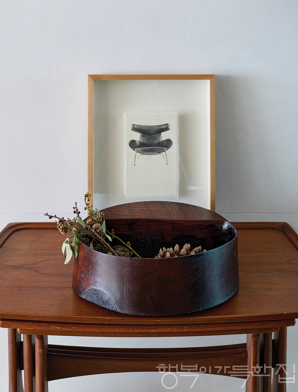 한지에 아이코닉 가구를 인화한 남종현 사진가의 작품과 인테리어 디자이너 이길연 대표가 선물해준 나무 함.