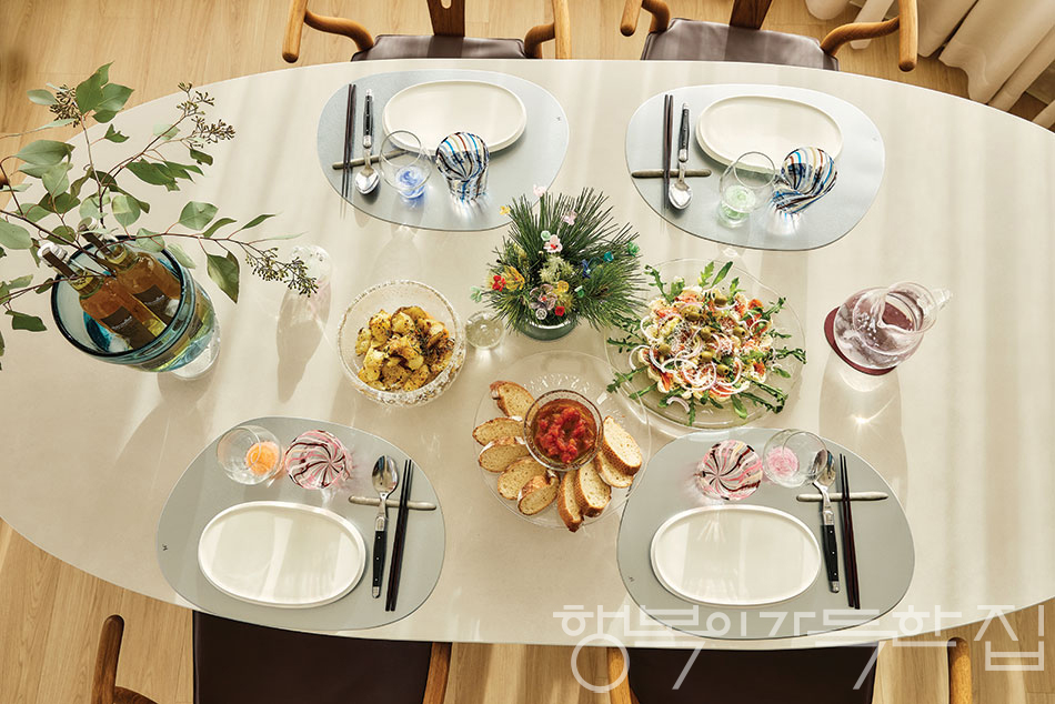 촬영 날에도 그가 테이블에 펼치는 마리아주를 경험할 수 있었다. 삶고 으깬 뒤 오븐에 한 번 더 구워 바삭함을 살린 감자는 순은 조각이 눈꽃처럼 펼쳐진 유리 볼에 담은 후 그라나 파다노 치즈를 곁들였고, 스페인 여행에서 맛보고 그 신선함에 반한 판 콘 토마테(올리브 오일에 버무린 토마토를 바게트 위에 얹어 먹는 요리)는 반짝이는 기포가 아름다운 벨 트레이에 올렸다. 연어와 루콜라의 조합이 아름다운 스모크드 샐먼 스노보드, 다양한 시즈닝을 더해 구운 우대갈비까지. 모두 손님을 초대할 때 즐겨 선보이는 대표 메뉴다.