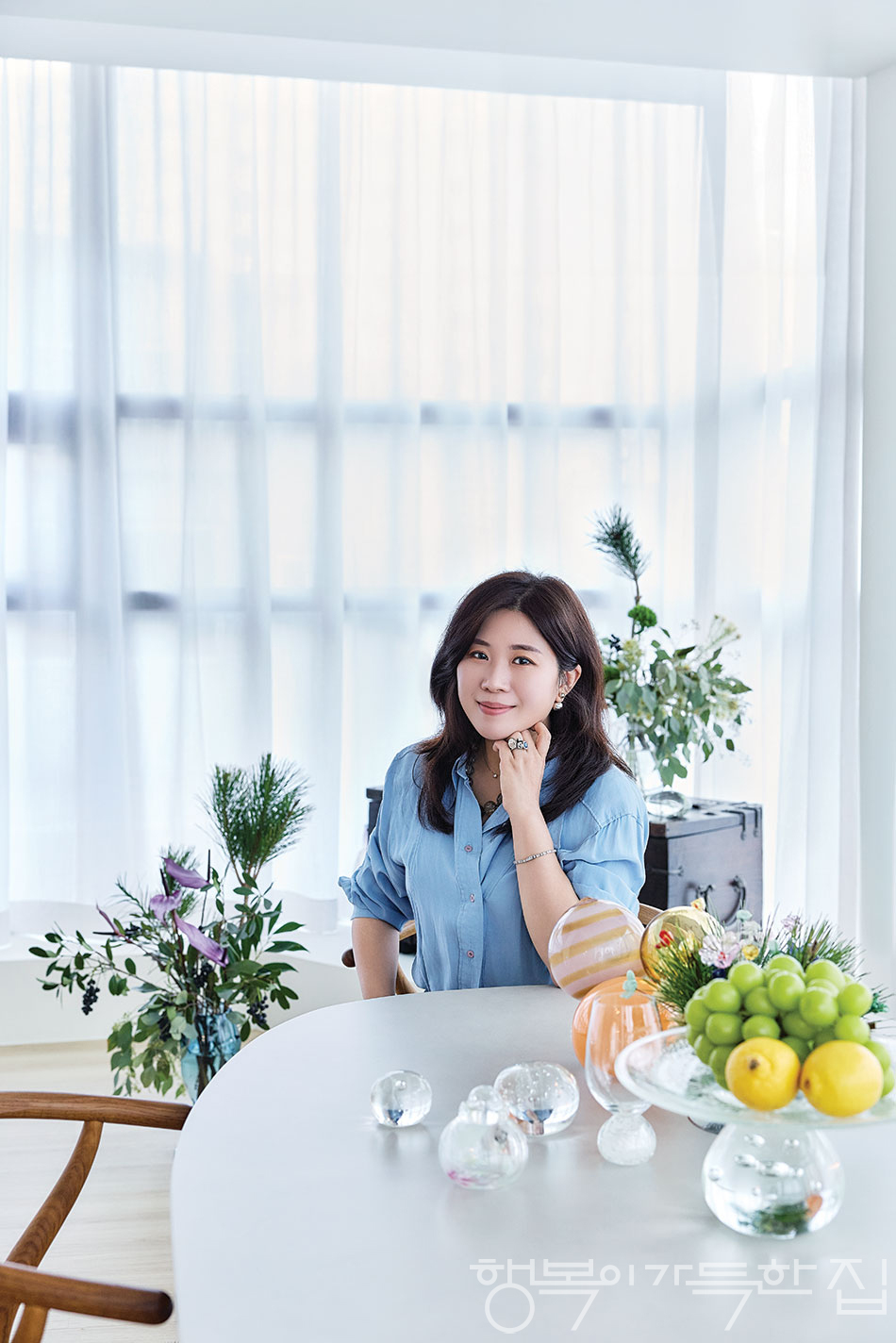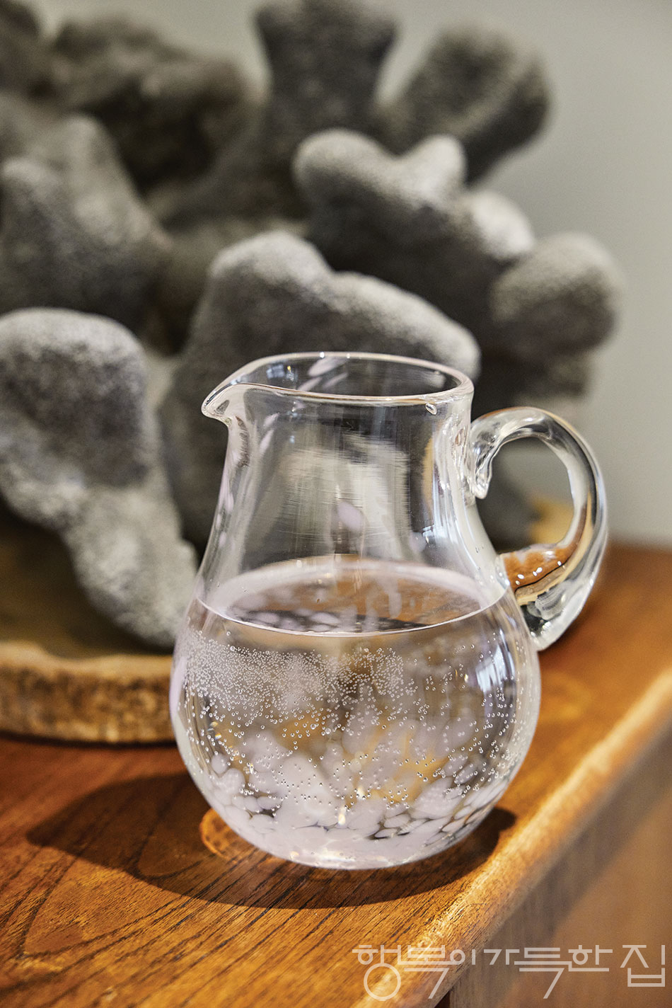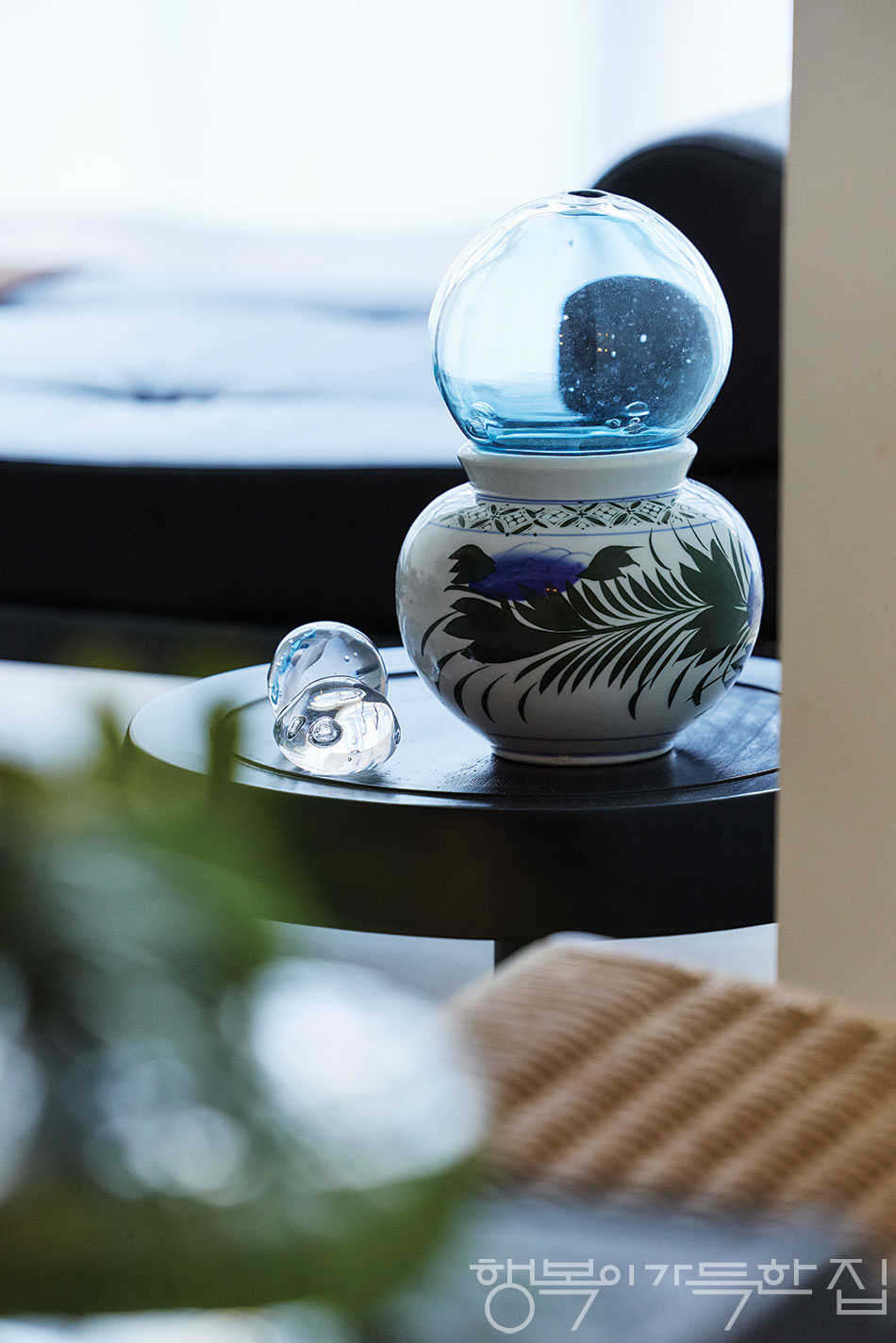 가까운 지인이던 스튜디오 익센트릭(studio-eccentric.com) 김석훈 대표와 시공을 담당한 아즈랩 김지애 소장은 부부의 요구를 반영해 갤러리의 분위기와 생활의 온기가 공존하는 공간을 완성했다. 일주일에 여섯 번 지인을 초대할 만큼 모임을 즐기는 부부답게 가장 공들인 곳은 거실이다. 응접실과 다이닝룸, 주방까지 하나로 합친 공간에는 사방으로 난 통창을 통해 매시간 다른 위치에서 햇살이 드나든다. 거실 한편에는 유리구슬을 호롱호롱 엮어 만든 오브제가 매달려 있고, 라운지체어 옆에는 커다란 빛 방울을 품은 문진과 화병이 놓였다. 직접 불어 만든 조명을 설치한 주방에는 남편이 수집한 도자와 양유완 작가의 유리그릇, 색색의 잔이 어우러지며 집의 추구미를 완성한다.