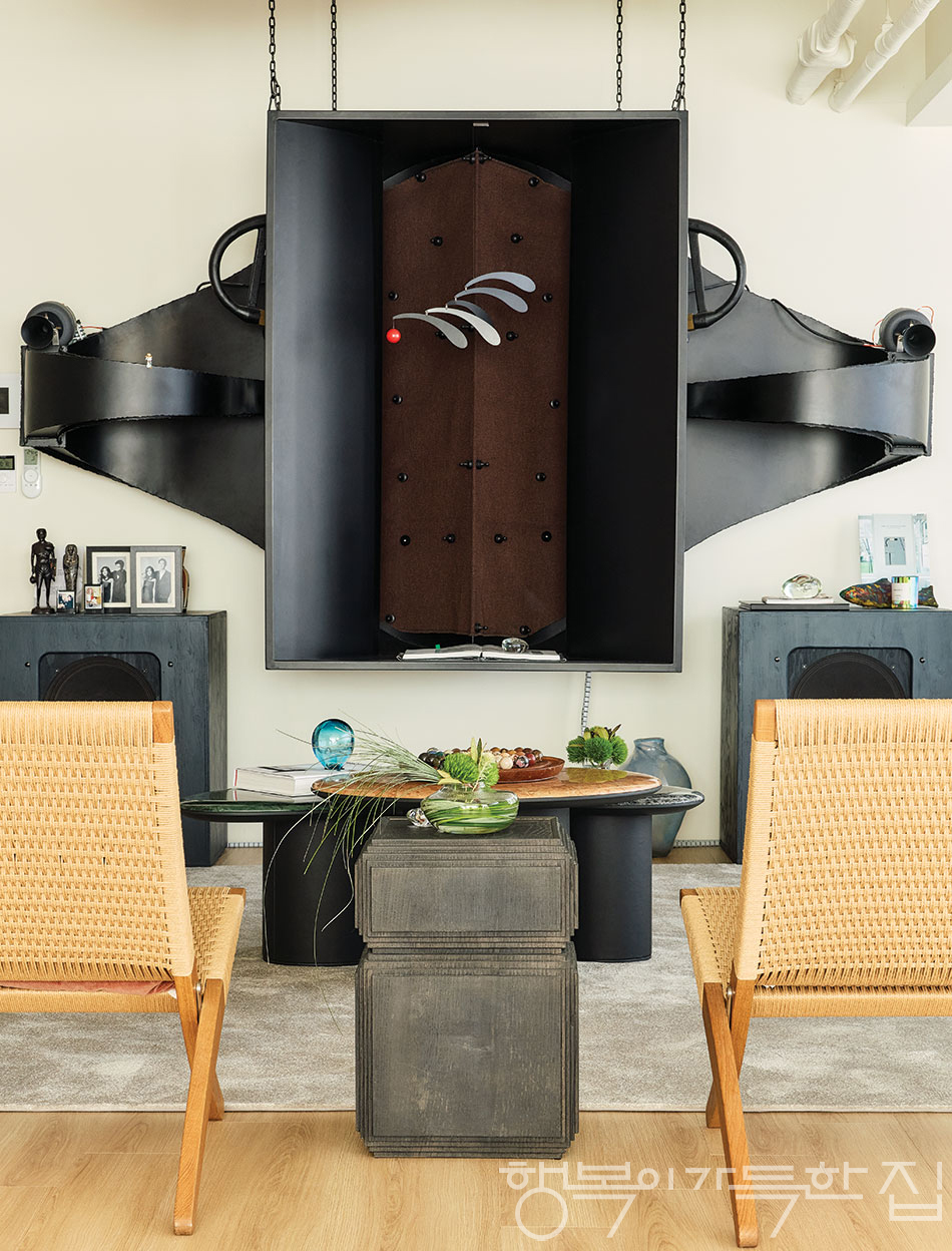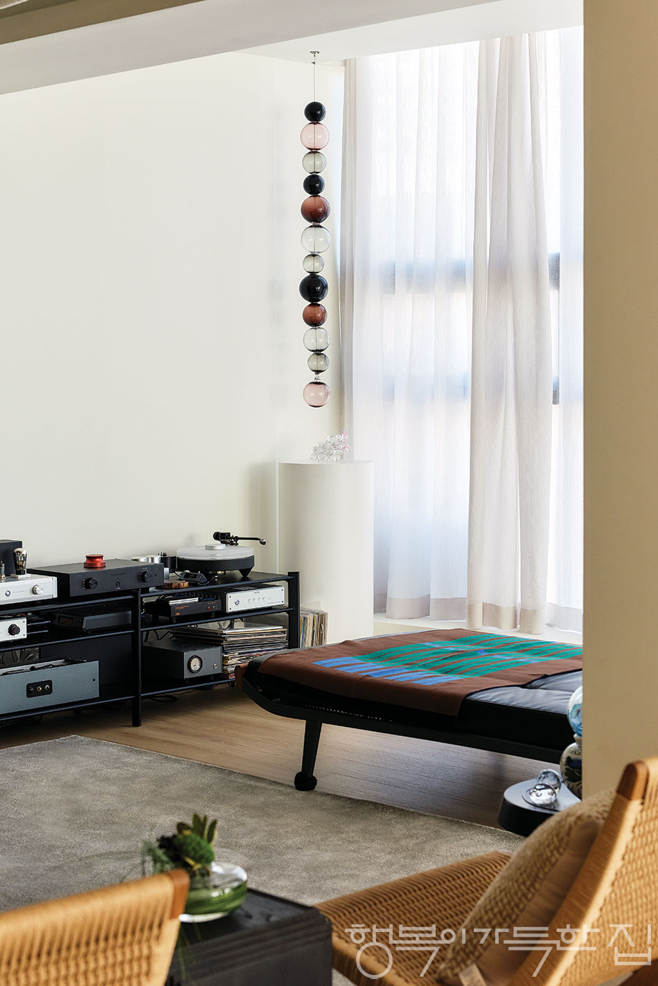 남편인 양성모 포토그래퍼가 취미인 음악 감상을 즐기는 거실. 한 켠에는 유리구슬을 이어 만든 오브제를 천장에 달아두었다.