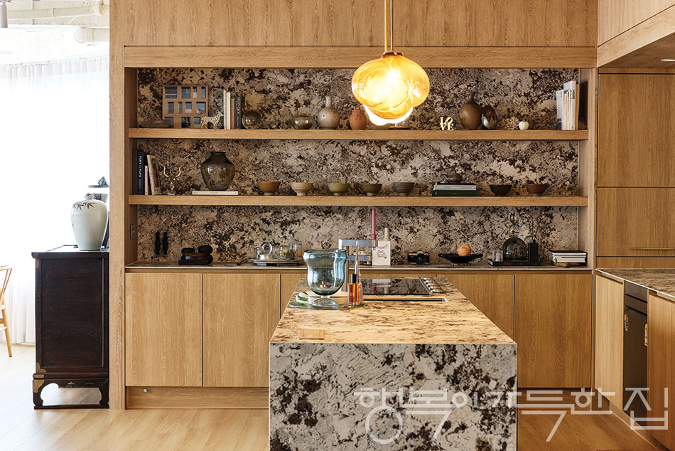 주방 한편에는 양유완 작가의 유리 작업과 남편이 수집한 도자를 전시해두었다. 아일랜드 주방과 벽은 패턴이 마음에 들었던 윤현상재의 타일로 마감하고, 나머지 가구는 목재로 따뜻한 느낌을 자아냈다. 펜던트 조명도 그의 작업이다.