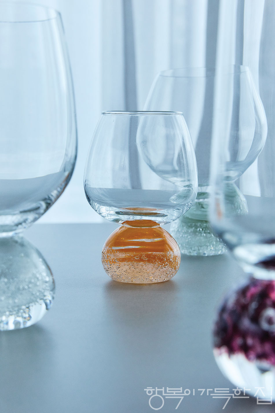 유리는 와인 잔이나 접시는 물론 벨 돔, 케이크 스탠드 등 무궁무진한 쓰임을 품은 소재였다. 특별한 날 샴페인 잔을 부딪치는 순간, 기분 좋은 밤 소주 한잔 나누는 시간에 행복감을 북돋아주는 존재이기도 했다. 그는 자신의 작업 또한 고이 모셔두는 작품보다 자주 곁에 두고 즐기는 반려 도구가 되길 바랐다. 유리 하면 떠오르는 정교하고 섬세한 모습 대신 두껍고 손맛이 살아 있는 형태를 택한 이유다.