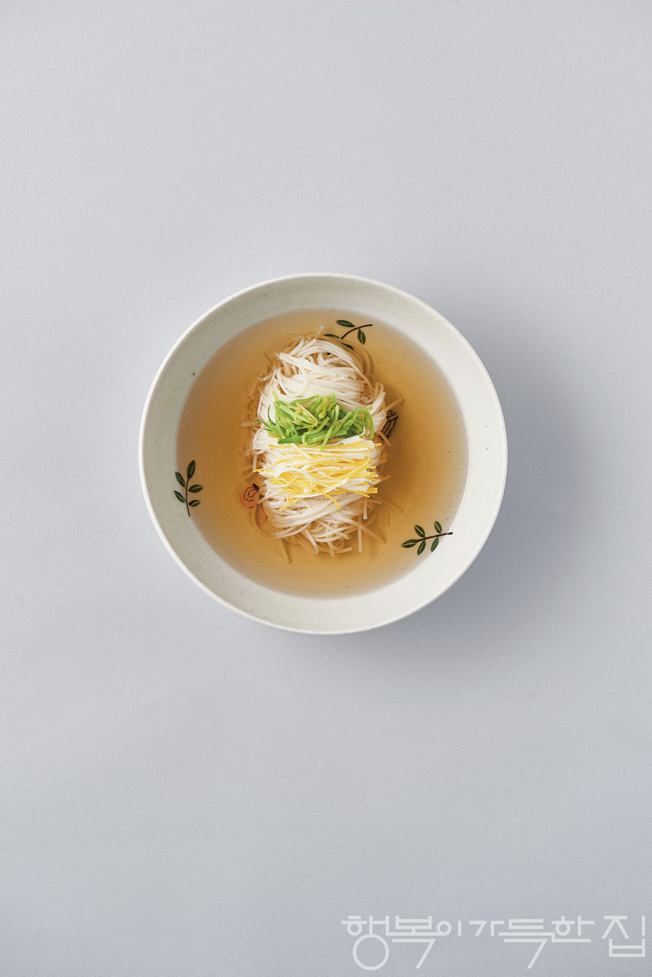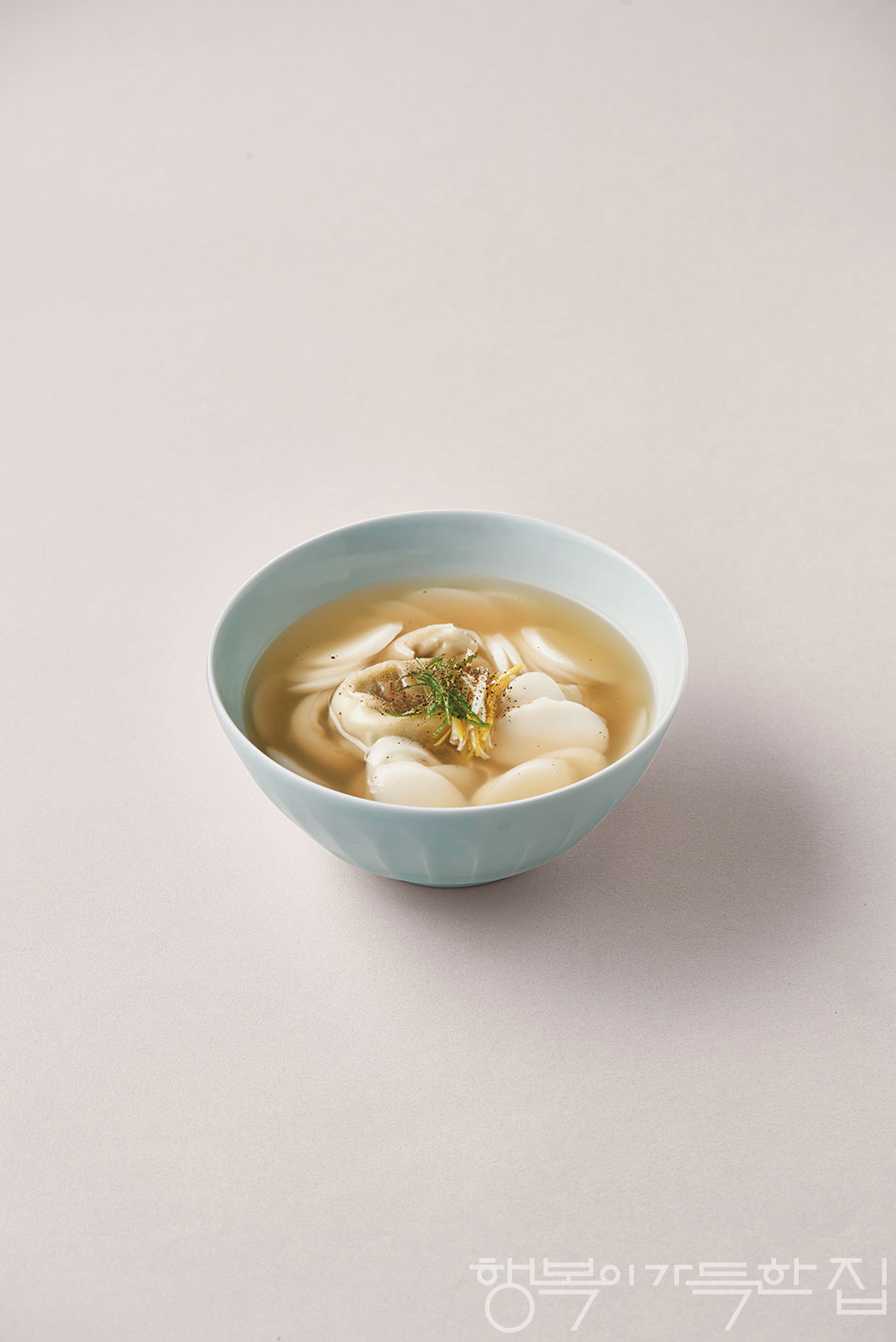 잡스러운 맛이 섞이지 않은 희고 밍밍한 음식은 복을 기원하는 자리에 빠지는 법이 없다. 정월 초하룻날에 떡국으로 새해를 맞는 경우가 대표적이다. 조선 시대 서울의 풍속을 담은 <열양세시기>만 봐도 “흰떡을 조금씩 떼어 손으로 비벼 둥글고 길게 문어발처럼 늘이는데, 이를 권모拳摸(골무떡)라고 한다. 섣달그믐에 엽전 모양으로 잘게 썰어 장국에 넣어 식구대로 한 그릇씩 먹으니 이를 떡국이라고 한다”고 나와 있다. 순백색의 흰떡은 다름 아닌 가래떡으로, 예전에는 그 당시의 화폐인 엽전 모양으로 썰어 즐겼다. 떡국에는 한 살을 더 먹는다는 상징적 의미는 물론, 새해를 풍요롭게 살고자 하는 기원이 담겨 있는 것. 여기에 복을 상징하는 만두를 넣는 것도 같은 의미다. 요즘은 만두를 직접 빚기보다 냉동 만두를 활용하는 경우가 흔한데, 국물 요리용이라면 살펴볼 점이 있다. 만두소로 고기가 듬뿍 들어가야 국물이 진해 맛있다. 또한 시판 장국이나 사골곰탕을 활용하면 진한 국물 맛을 손쉽게 더할 수 있어 별미다.