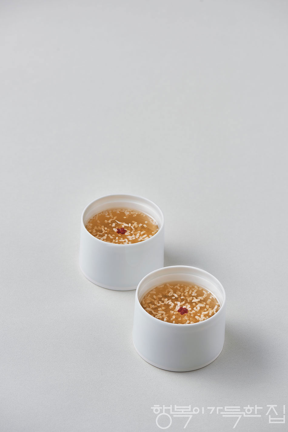 ⑥ 통계피와 생강은 건져내고 냉장고에 넣어 차게 식힌 뒤 그릇에 국물을 담고, 따로 건져놓은 밥알을 한 숟가락씩 띄운다.