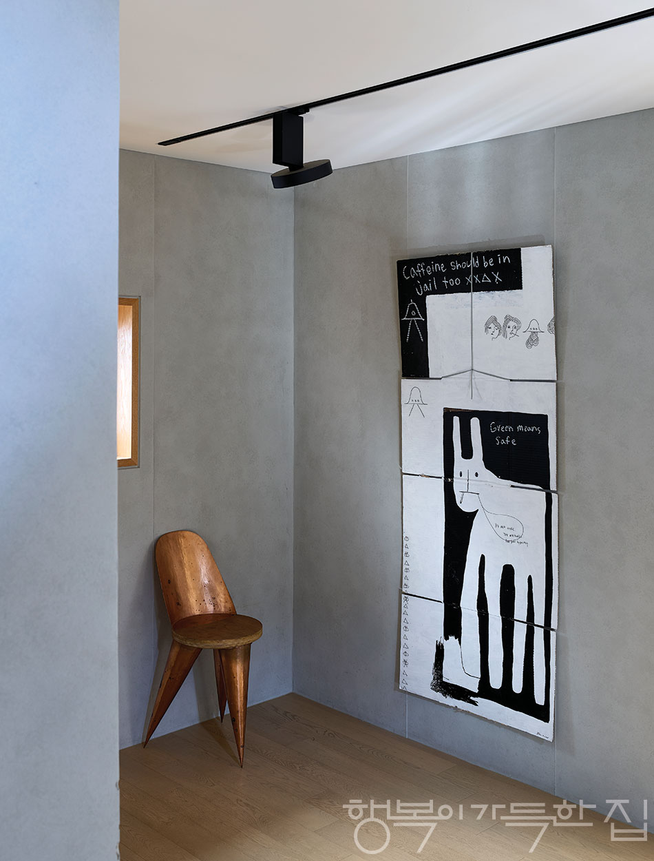“내 가치 판단으로 채운 삶이라야 행복이 가득한 삶인 거잖아요? 나한테 의미 있고 나한테 멋진 걸로 주변을 채우고 남들이 좋다는 작품 말고 나 스스로 ‘이거다’ 하는 작품을 갖는 삶이 멋지다고 생각해요. 다른 사람들이 좋다고 하는 걸 사자 치면 끝이 없어요. 돈으로 따져도 끝이 없고, 좋은 가구나 조명 및 그림을 사겠다고 쳐도 끝이 없지요.”